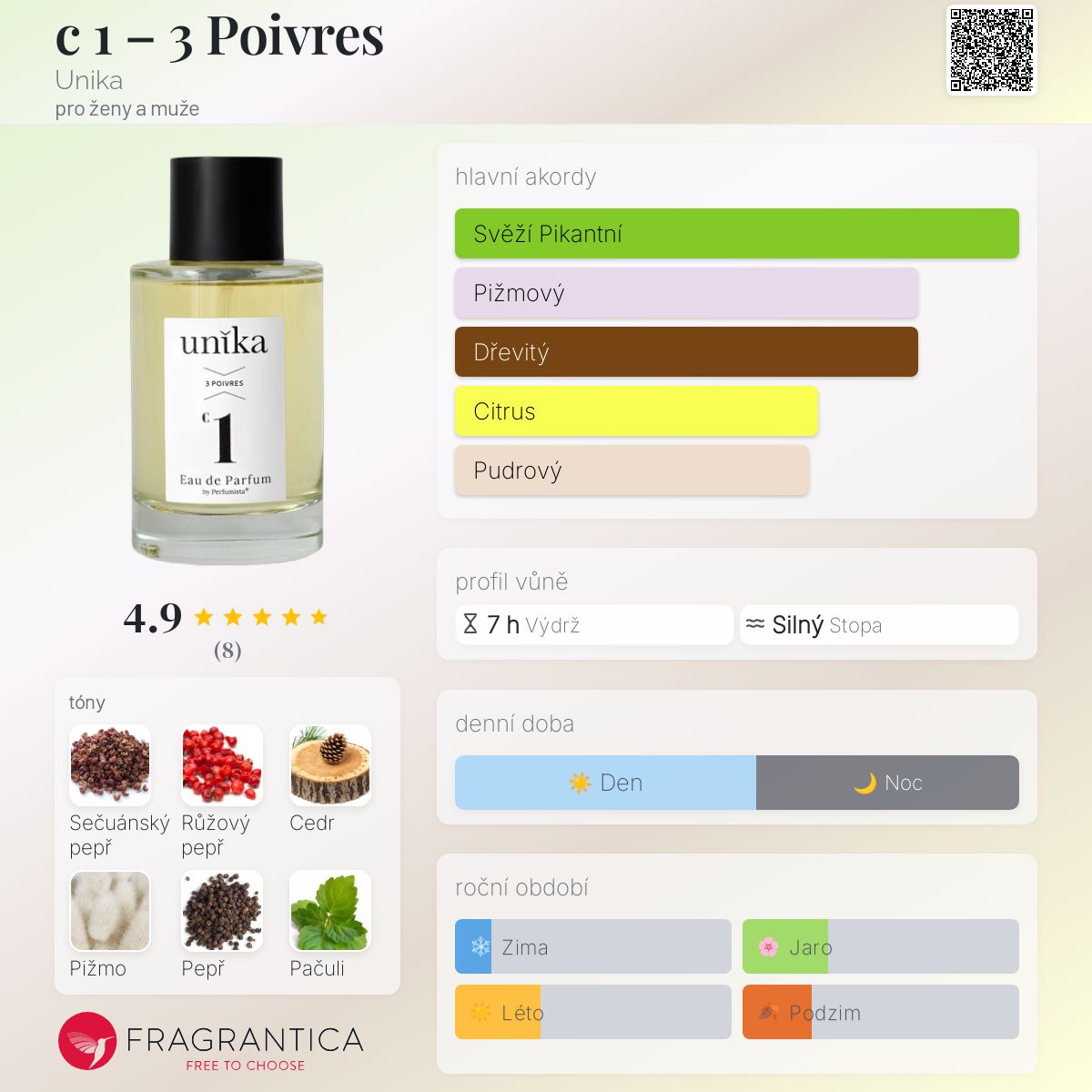 c 1 – 3 Poivres podle Unika je Woody Spicy vůně pro ženy a muže. Toto je nová vůně. c 1 – 3 Poivres byl/a uveden/a v roce 2025. "Nosem" za touto vůní je Véronique Stambouli. Vrchní tóny jsou Sečuánský pepř, Růžový pepř a Černý pepř; střední tóny jsouVirginský cedr a Pačuli ; základní tóny jsou Pižmo a Dubový mech.