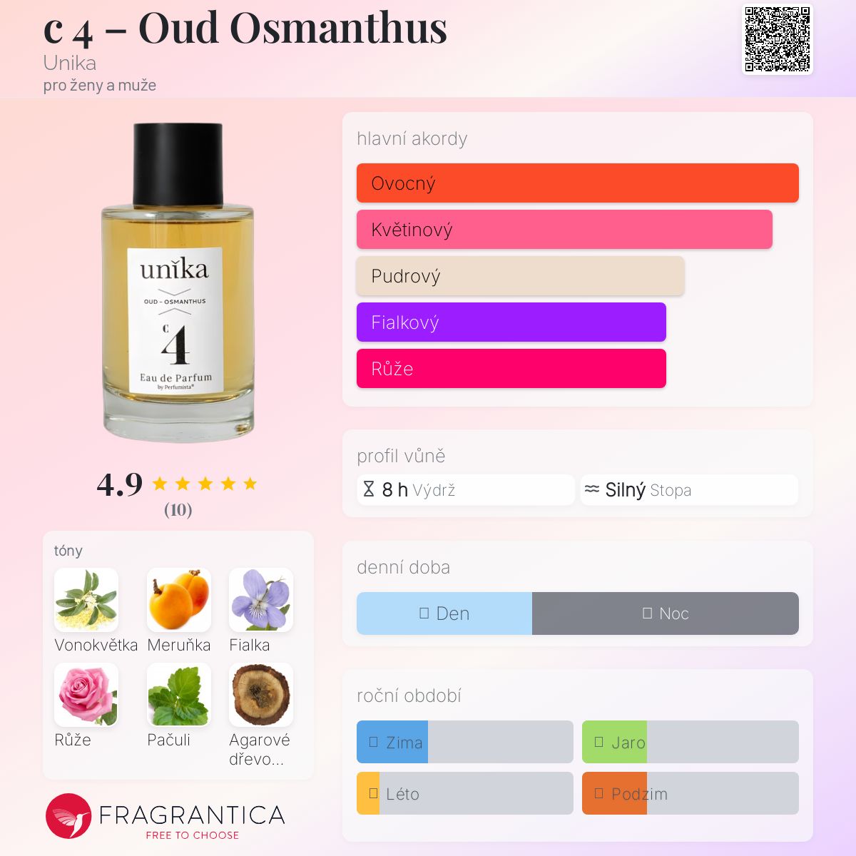 c 4 – Oud Osmanthus podle Unika je Orientální Floral vůně pro ženy a muže. Toto je nová vůně. c 4 – Oud Osmanthus byl/a uveden/a v roce 2025. "Nosem" za touto vůní je Véronique Stambouli. Vrchní tóny jsou Vonokvětka, Broskev a Švestka; střední tóny jsouMeruňka, Fialka a Růže ; základní tóny jsou Agarové dřevo (oud), Pačuli a Vanilka.