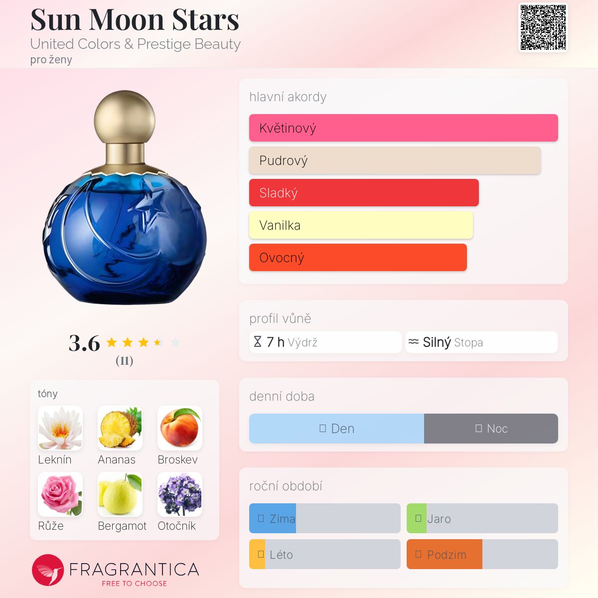 Sun Moon Stars podle United Colors & Prestige Beauty je Orientální Floral vůně pro ženy. Sun Moon Stars byl/a uveden/a v roce 2015. Vrchní tóny jsou Leknín, Ananas, Broskev, Růže a Bergamot; střední tóny jsouOtočník, Karafiát, Narcis a Orchidej ; základní tóny jsou Santalové dřevo, Vanilka, Jantar (ambra) a Pižmo.