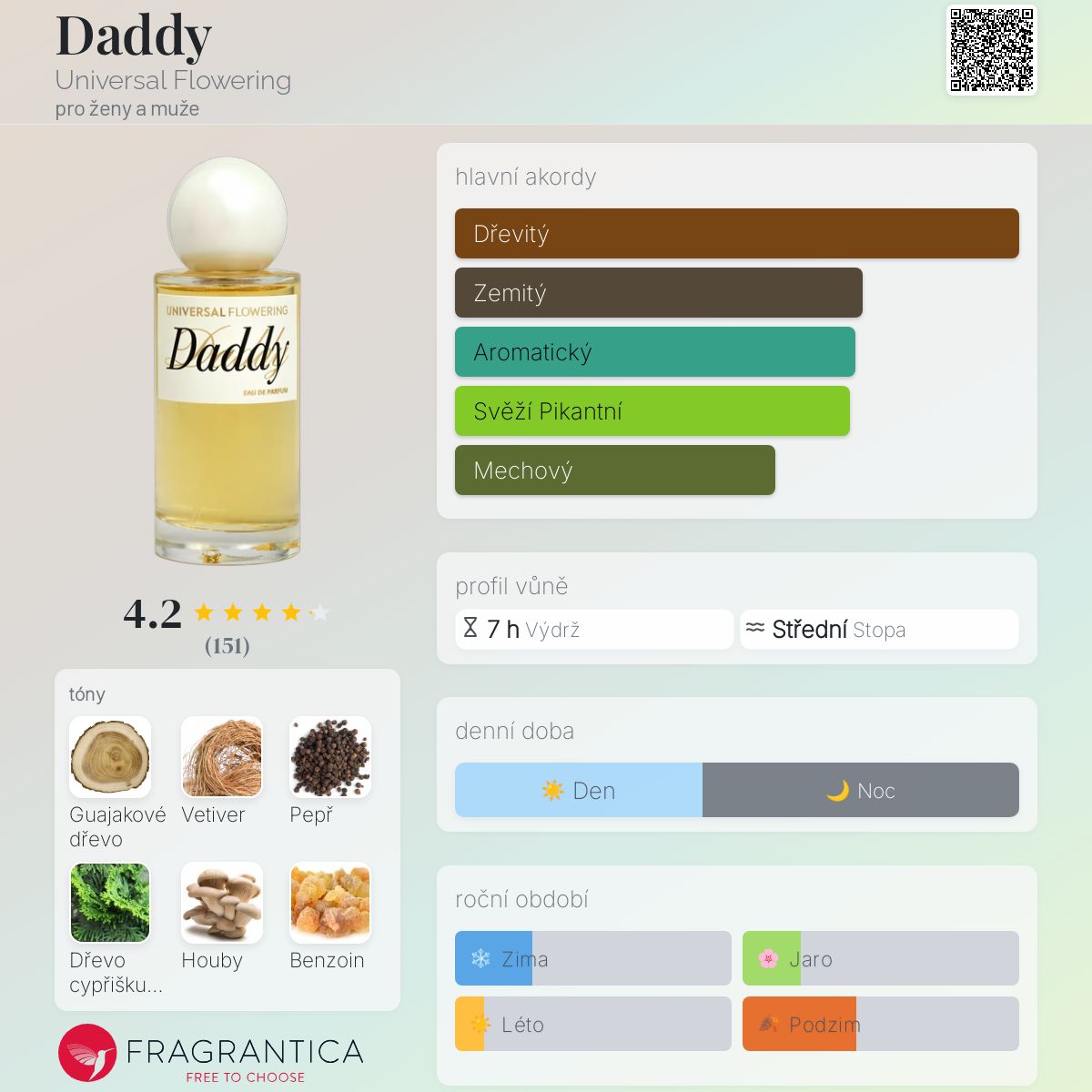 Daddy podle Universal Flowering je Aromatic Spicy vůně pro ženy a muže. Daddy byl/a uveden/a v roce 2016. "Nosem" za touto vůní je Courtney Rafuse. Vrchní tóny jsou Guajakové dřevo a Černý pepř; střední tóny jsouCypřišek tupolistý a Houby ; základní tóny jsou Vetiver, Benzoin a Dubový mech.