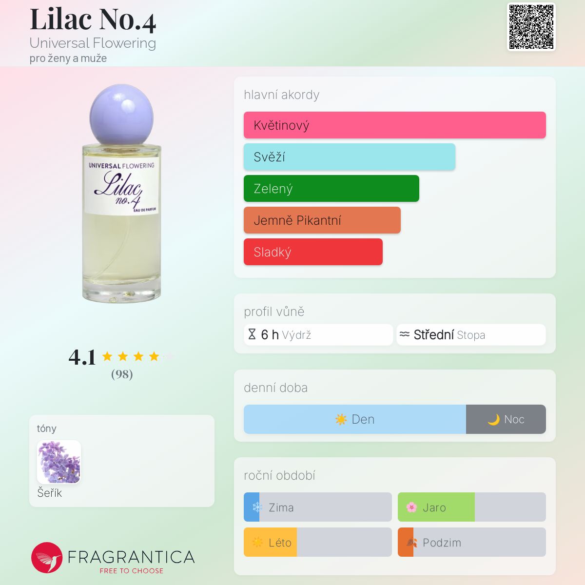 Lilac No.4 podle Universal Flowering je Floral vůně pro ženy a muže. Lilac No.4 byl/a uveden/a v roce 2016. "Nosem" za touto vůní je Courtney Rafuse.