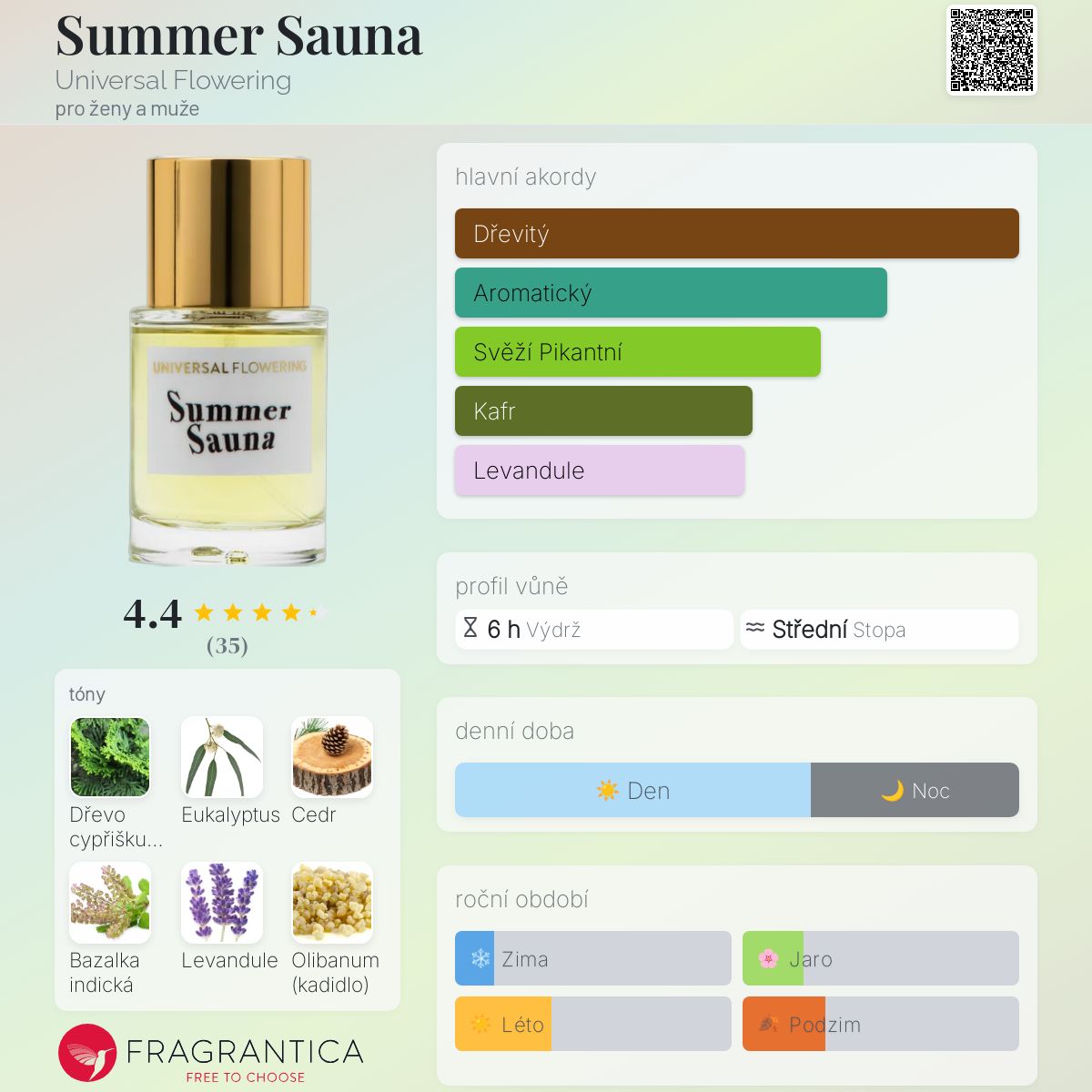 Summer Sauna podle Universal Flowering je Aromatic Green vůně pro ženy a muže. Summer Sauna byl/a uveden/a v roce 2016. "Nosem" za touto vůní je Courtney Rafuse. Vrchní tóny jsou Dřevo cypřišku tupolistého a Eukalyptus; střední tóny jsouBazalka indická, Levandule a Olibanum ; základní tóny jsou Cedr a Mech.