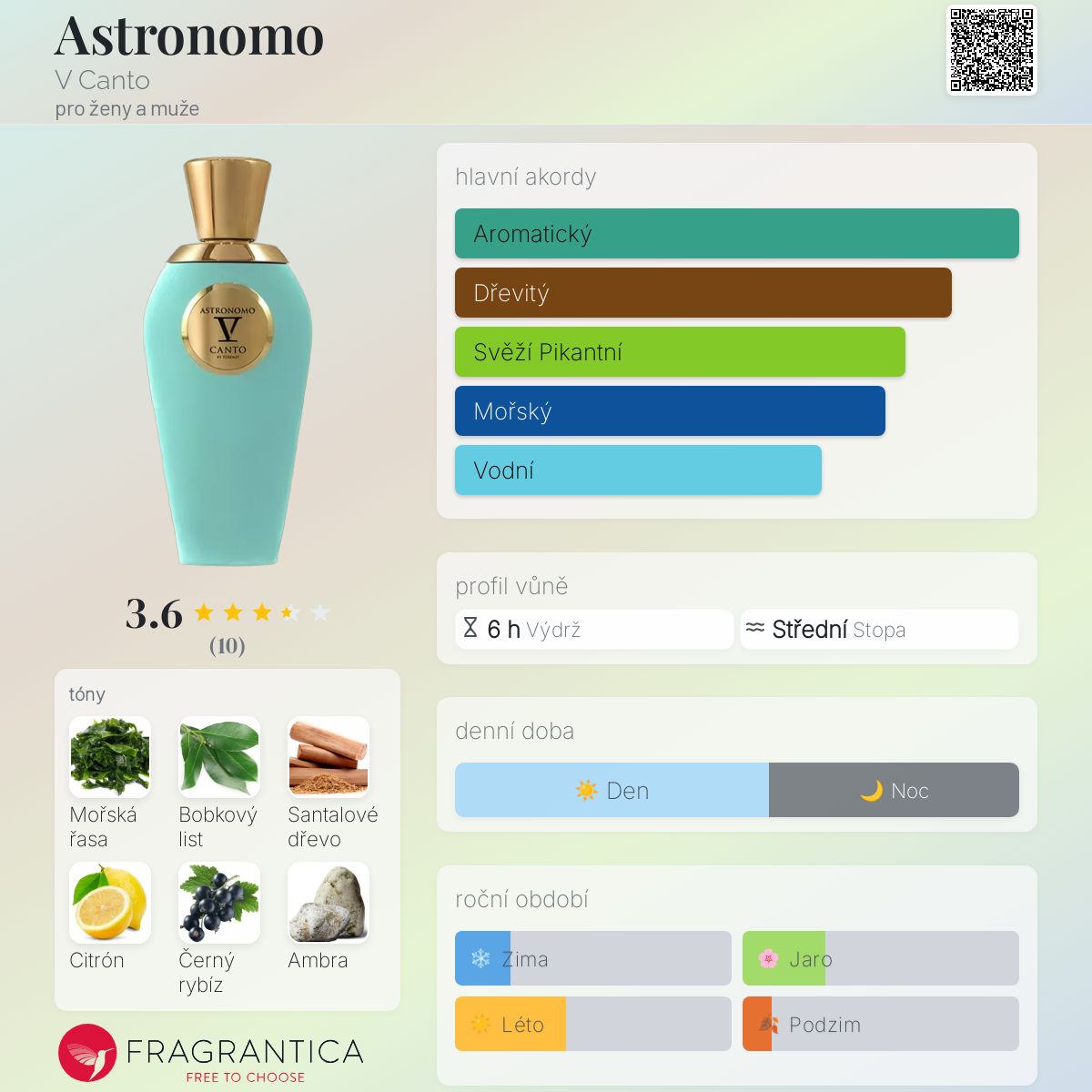 Astronomo podle V Canto je Woody Aromatic vůně pro ženy a muže. Toto je nová vůně. Astronomo byl/a uveden/a v roce 2025. "Nosem" za touto vůní je Paolo Terenzi. Vrchní tóny jsou Mořská řasa, Citrón, Bulharská růže, Grapefruit a Kardamom; střední tóny jsouVavříny, Černý rybíz, Ambra, Rozmarýn, Jalovec, Indický jasmín, Růžový pepř, Levandule a Jasmín Sambac ; základní tóny jsou Australské santalové dřevo, Dubový mech, Cedr, Eben a Pižmo.