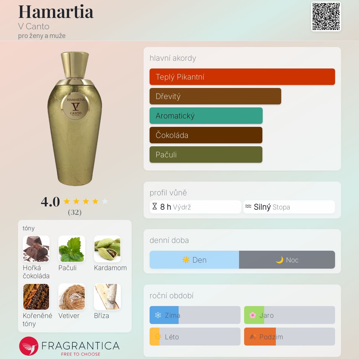 Hamartia podle V Canto je vůně pro ženy a muže. Toto je nová vůně. Hamartia byl/a uveden/a v roce 2023. "Nosem" za touto vůní je Paolo Terenzi. Vrchní tóny jsou Čokoláda, Kardamom, Koření, Káva, Kalábrijský bergamot a Koriandr; střední tóny jsouSingapurské pačuli, Karamel, Bourbonská vanilka, Konvalinka a Vonokvětka ; základní tóny jsou Haitský vetiver, Bříza, Pižmo, Vzácné dřevo, Agarové dřevo (oud), Fazole tonka a Cedr.