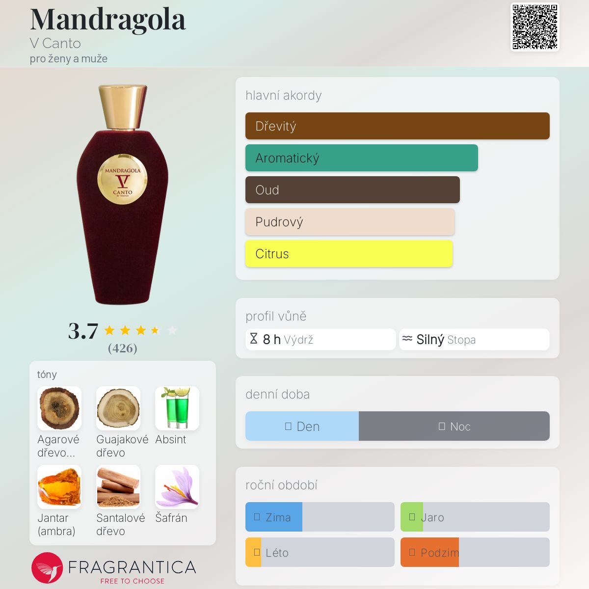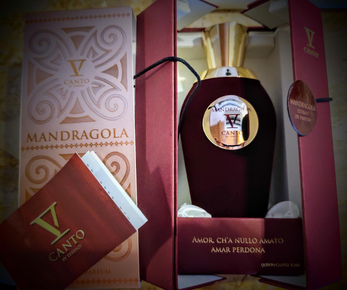 Mandragola podle V Canto je Orientální Woody vůně pro ženy a muže. Mandragola byl/a uveden/a v roce 2016. "Nosem" za touto vůní je Paolo Terenzi. Vrchní tóny jsou Absint, Šafrán, Limetka a Bergamot; střední tóny jsouGuajakové dřevo, Bulharská růže, Pižmo, Petitgrain a Jasmín ; základní tóny jsou Agarové dřevo (oud), Jantar (ambra), Santalové dřevo, Vanilka a Vetiver.