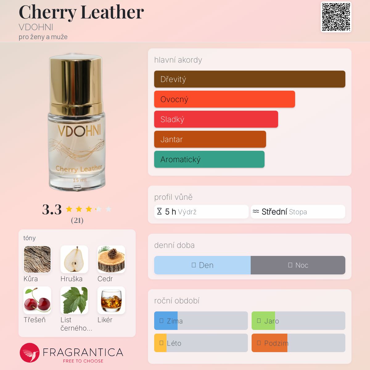 Cherry Leather podle VDOHNI je Orientální Vanilla vůně pro ženy a muže. Toto je nová vůně. Cherry Leather byl/a uveden/a v roce 2024. "Nosem" za touto vůní je Polina Kazakova. Vrchní tóny jsou Třešeň, List černého rybízu, Koření a Bergamot; střední tóny jsouKůra, Hruška, Likér, Mandle, Fazole tonka a Vetiver ; základní tóny jsou Cedr, Labdanum, Jantar (ambra) a Kůže.