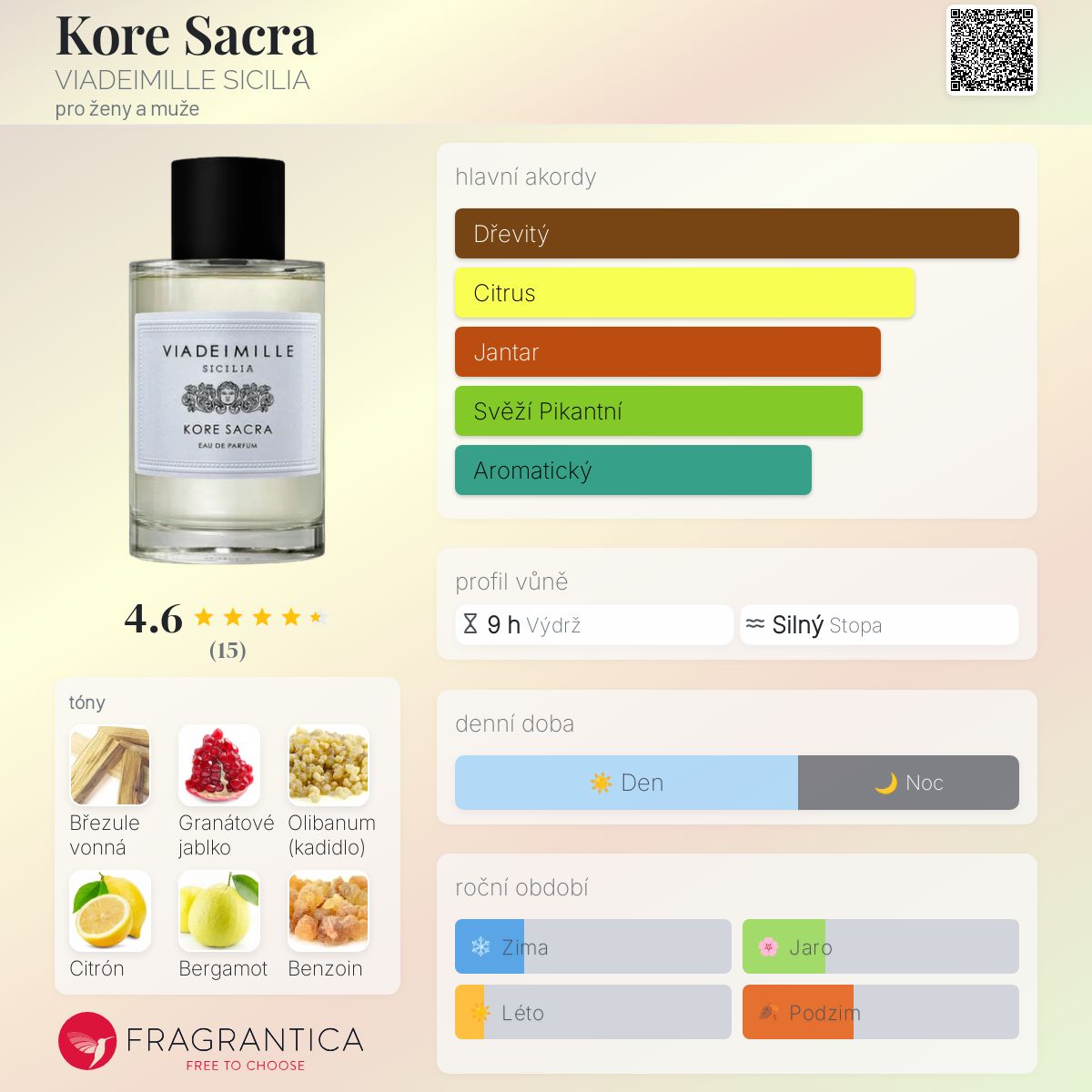 Kore Sacra podle VIADEIMILLE SICILIA je vůně pro ženy a muže. Kore Sacra byl/a uveden/a v roce 2021. "Nosem" za touto vůní je Nathalie Koobus.