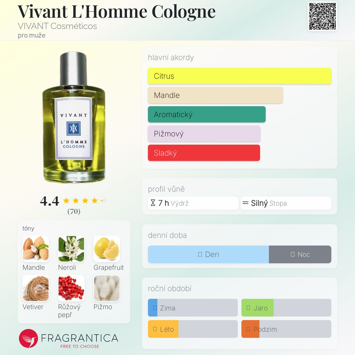 Vivant L'Homme Cologne podle VIVANT Cosméticos je Citrus Aromatic vůně pro muže. Vivant L'Homme Cologne byl/a uveden/a v roce 2023. Vrchní tóny jsou Grapefruit, Růžový pepř, Bergamot a Pomeranč; střední tóny jsouMandle a Neroli ; základní tóny jsou Vetiver a Pižmo.