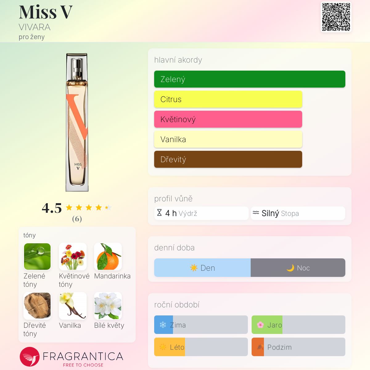 Miss V podle VIVARA je Floral vůně pro ženy. Miss V byl/a uveden/a v roce 2018. Vrchní tóny jsou Zelené tóny, Květinové tóny a Mandarinka; střední tóny jsouBílé květy a Vodnaté tóny ; základní tóny jsou Dřevité tóny, Vanilka a Jantar (ambra).
