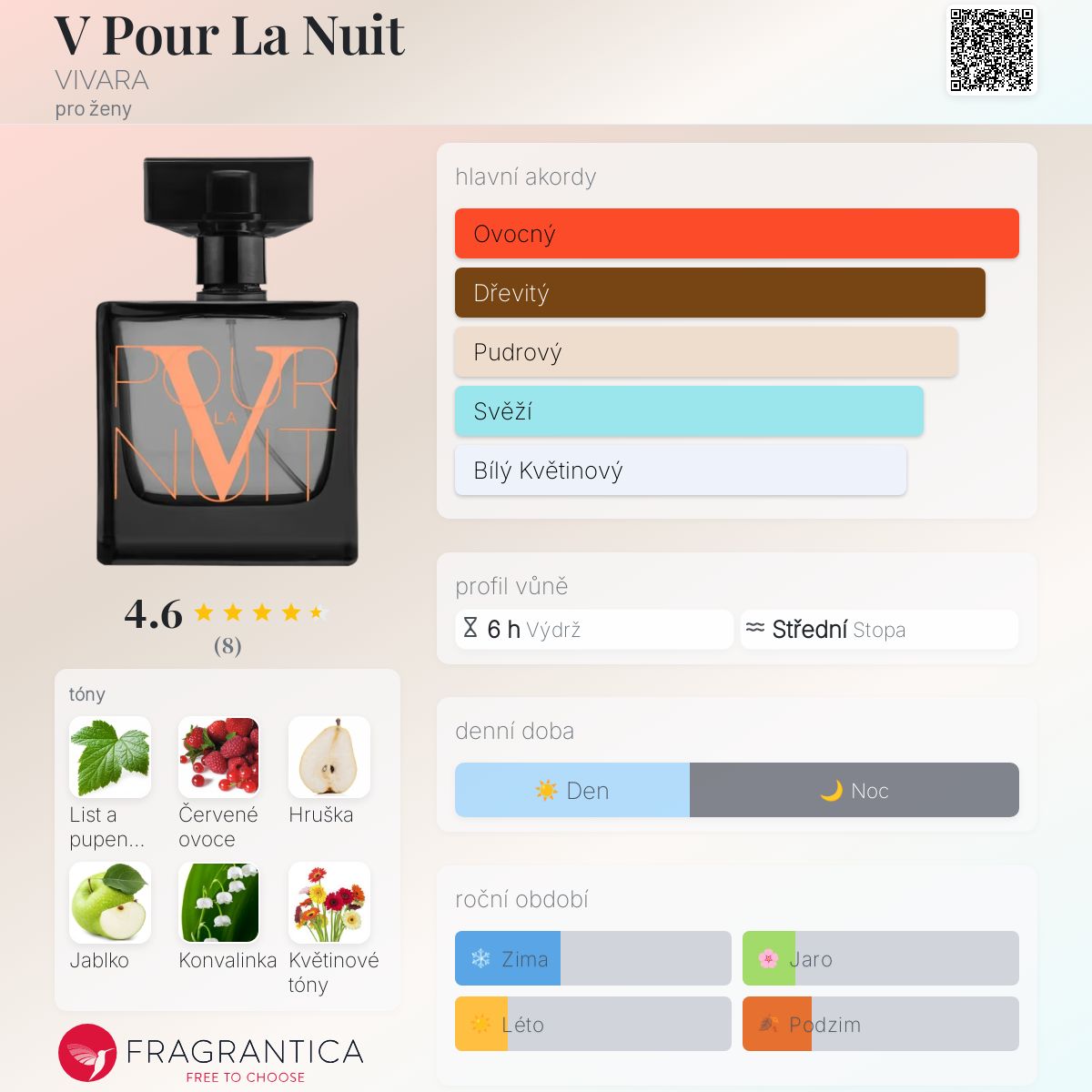 V Pour La Nuit podle VIVARA je Floral Fruity vůně pro ženy. V Pour La Nuit byl/a uveden/a v roce 2021. Vrchní tóny jsou Černý rybíz, Červené ovoce, Hruška a Jablko; střední tóny jsouKonvalinka, Květinové tóny, Ylang-Ylang, Jasmín a Otočník ; základní tóny jsou Vanilka, Santalové dřevo, Jantar (ambra), Cedr a Pižmo.