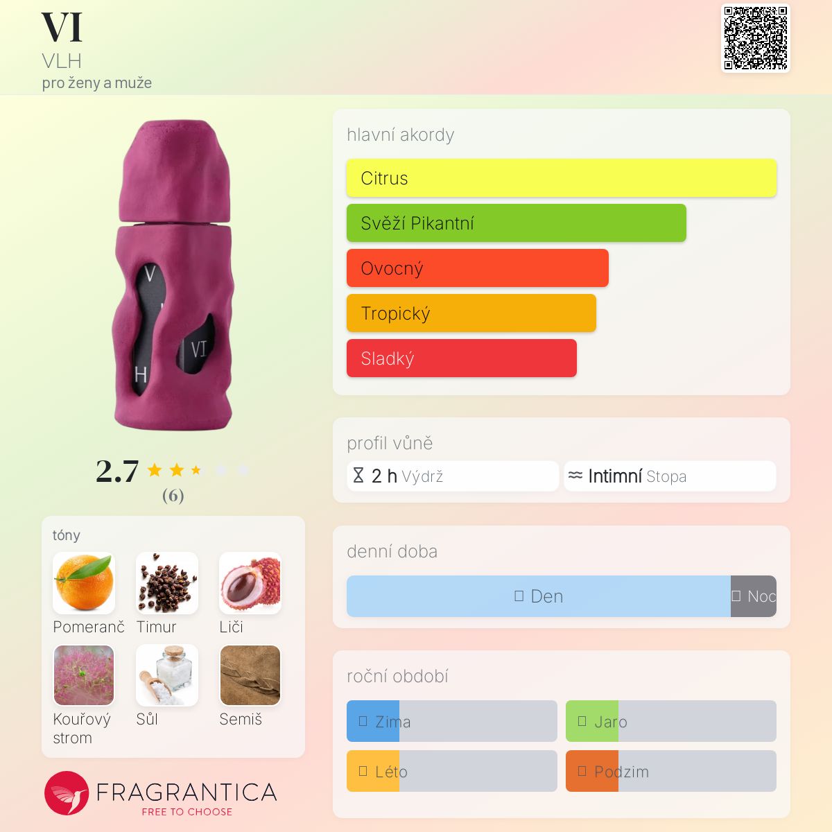 VI podle VLH je Orientální Fougere vůně pro ženy a muže. VI byl/a uveden/a v roce 2023. "Nosem" za touto vůní je Lesya Volkhonskaya. Vrchní tóny jsou Zelený pomeranč, Timur a Mořská sůl; střední tóny jsouLiči a Růžový lotos ; základní tóny jsou Kouřový strom, Semiš a Mech.