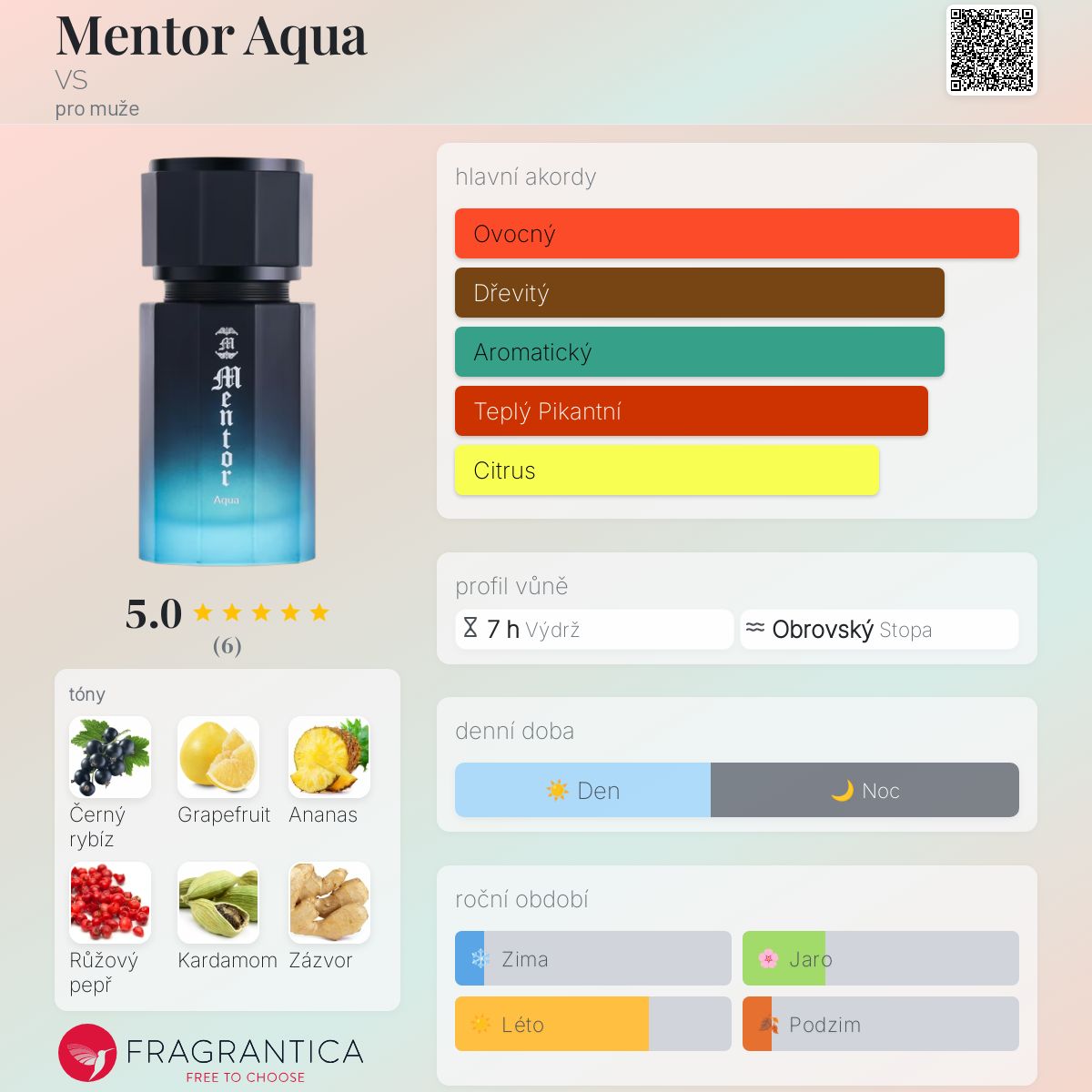 Mentor Aqua podle VS je Woody Spicy vůně pro muže. Toto je nová vůně. Mentor Aqua byl/a uveden/a v roce 2025. Vrchní tóny jsou Černý rybíz, Grapefruit a Ananas; střední tóny jsouRůžový pepř, Kardamom a Zázvor ; základní tóny jsou Pačuli, Vetiver a Jantar (ambra).