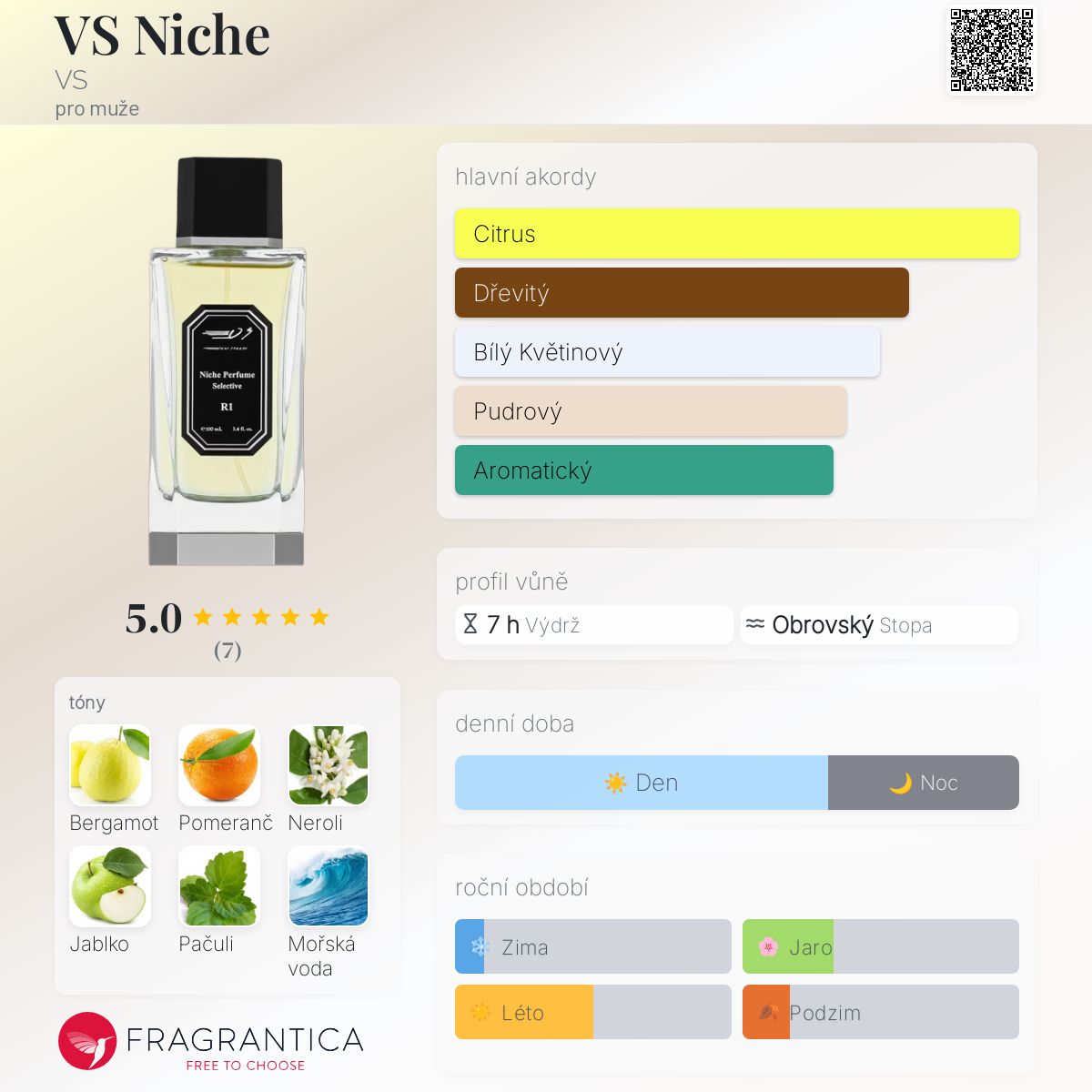 VS Niche podle VS je Woody Chypre vůně pro muže. VS Niche byl/a uveden/a v roce 2022. Vrchní tóny jsou Bergamot, Pomeranč, Neroli a Jablko; střední tóny jsouPačuli, Mořské tóny, Jasmín a Růže ; základní tóny jsou Vanilka, Cedr, Jantar (ambra) a Pižmo.