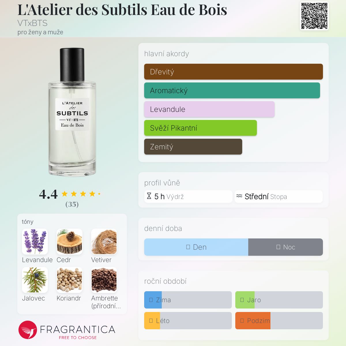 L'Atelier des Subtils Eau de Bois podle VTxBTS je Woody Aromatic vůně pro ženy a muže. L'Atelier des Subtils Eau de Bois byl/a uveden/a v roce 2019. Vrchní tóny jsou Jalovec a Koriandr; střední tóny jsouLevandule a Ambrette (přírodní pižmo) ; základní tóny jsou Cedr a Vetiver.
