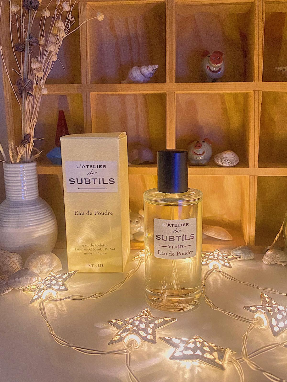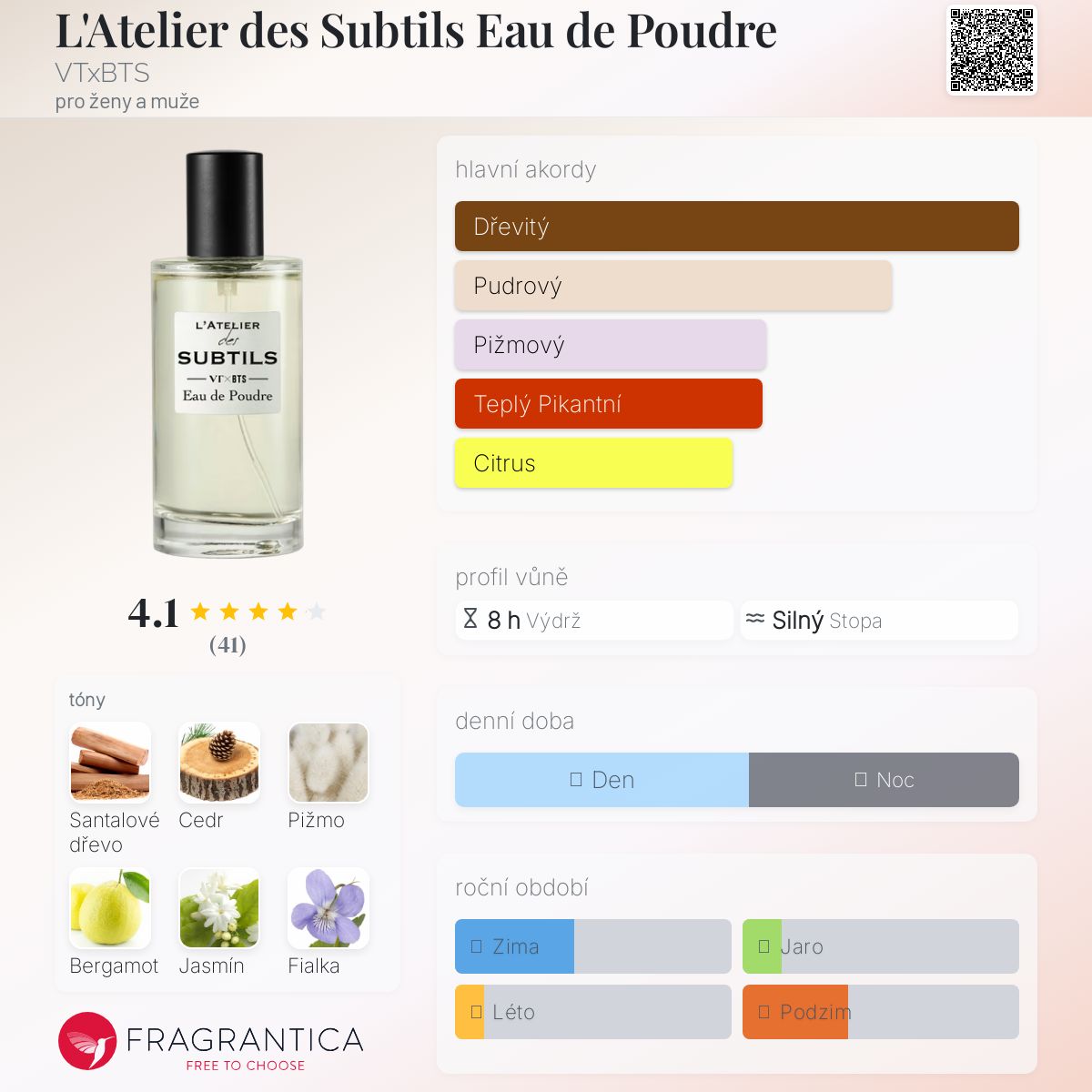 L'Atelier des Subtils Eau de Poudre podle VTxBTS je Orientální Floral vůně pro ženy a muže. L'Atelier des Subtils Eau de Poudre byl/a uveden/a v roce 2019. "Nosem" za touto vůní je Frederic Burtin. Vrchní tóny jsou Bergamot, Černý rybíz, Jablko a Meloun; střední tóny jsouJasmín, Fialka, Švestka a Růže ; základní tóny jsou Santalové dřevo, Cedr a Bílé pižmo.