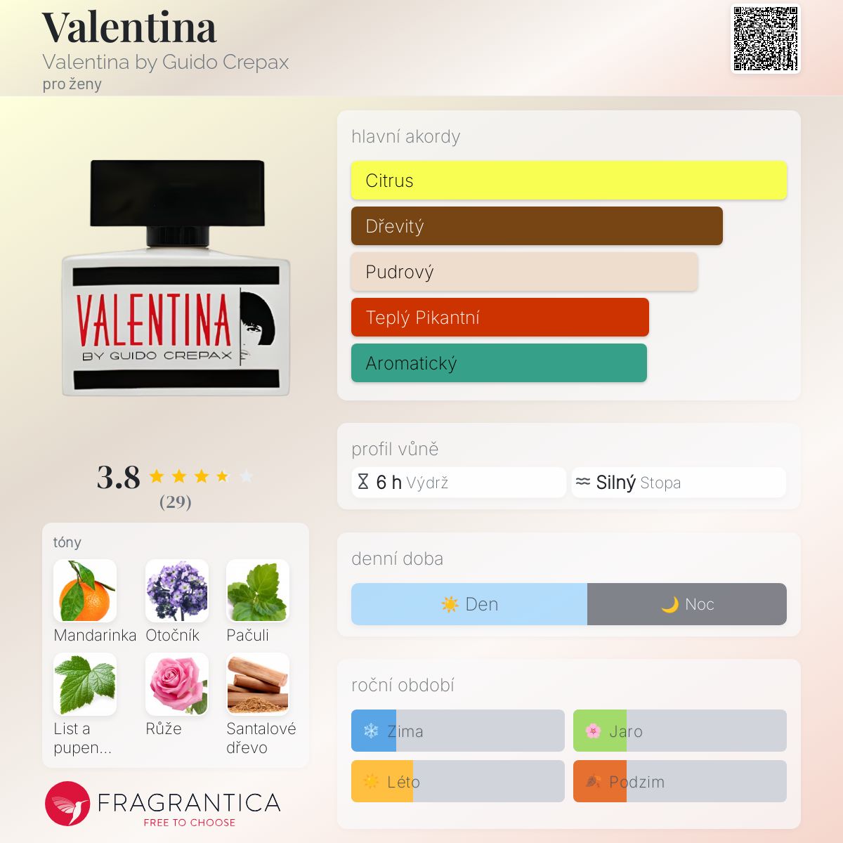 Valentina podle Valentina by Guido Crepax je Floral Fruity Gourmand vůně pro ženy. Valentina byl/a uveden/a v roce 2018. Vrchní tóny jsou Mandarinka, Černý rybíz, Bergamot a Růžový pepř; střední tóny jsouRůže a Jasmín ; základní tóny jsou Otočník, Pačuli, Santalové dřevo, Ambra, Čokoláda, Citrón a Pižmo.