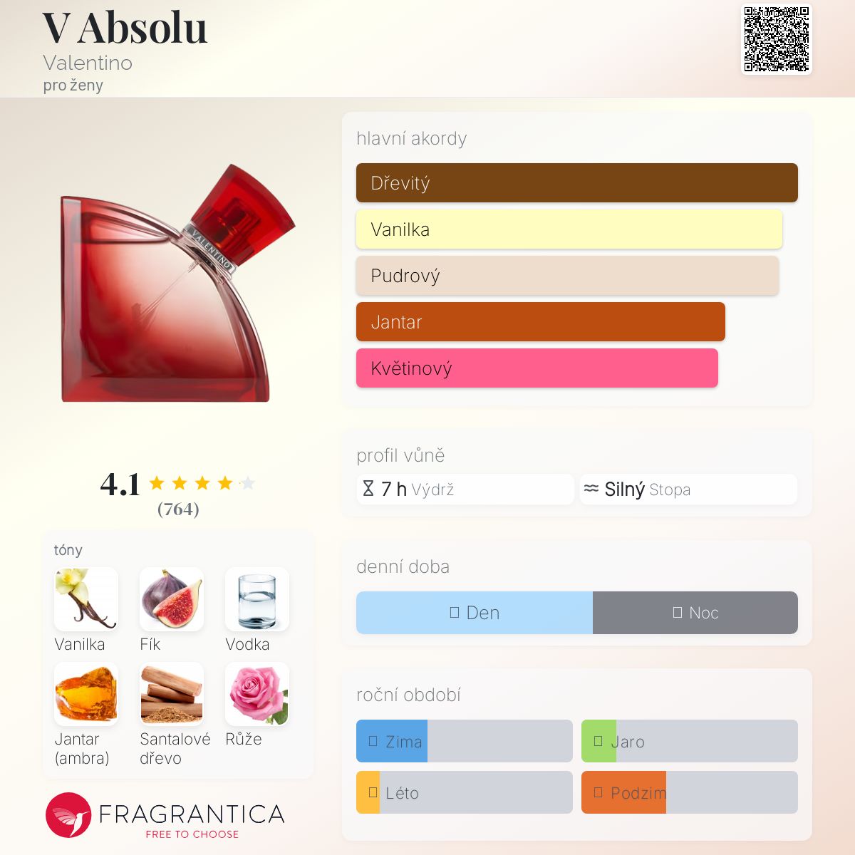 V Absolu podle Valentino je Floral Woody Musk vůně pro ženy. V Absolu byl/a uveden/a v roce 2005. Vrchní tóny jsou Fík, Vodka, Mandarinka, Frézie, Růžový grapefruit a Jedle balzámová; střední tóny jsouRůže, Otočník, Plumérie a Pomerančový květ ; základní tóny jsou Bourbonská vanilka, Jantar (ambra), Santalové dřevo, Kadidlo, Pižmo a Cedr.