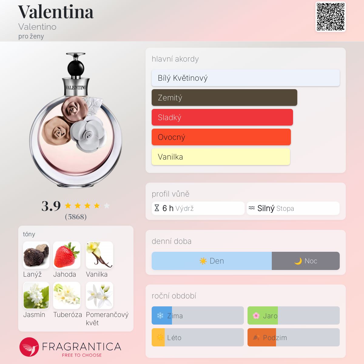 Valentina podle Valentino je Orientální Floral vůně pro ženy. Valentina byl/a uveden/a v roce 2011. Valentina byl/a vytvořen/a Alberto Morillas a Olivier Cresp. Vrchní tóny jsou Lanýž a Bergamot; střední tóny jsouJahoda, Jasmín, Tuberóza a Květ afrického pomeranče ; základní tóny jsou Vanilka, Jantar (ambra) a Virginský cedr.
