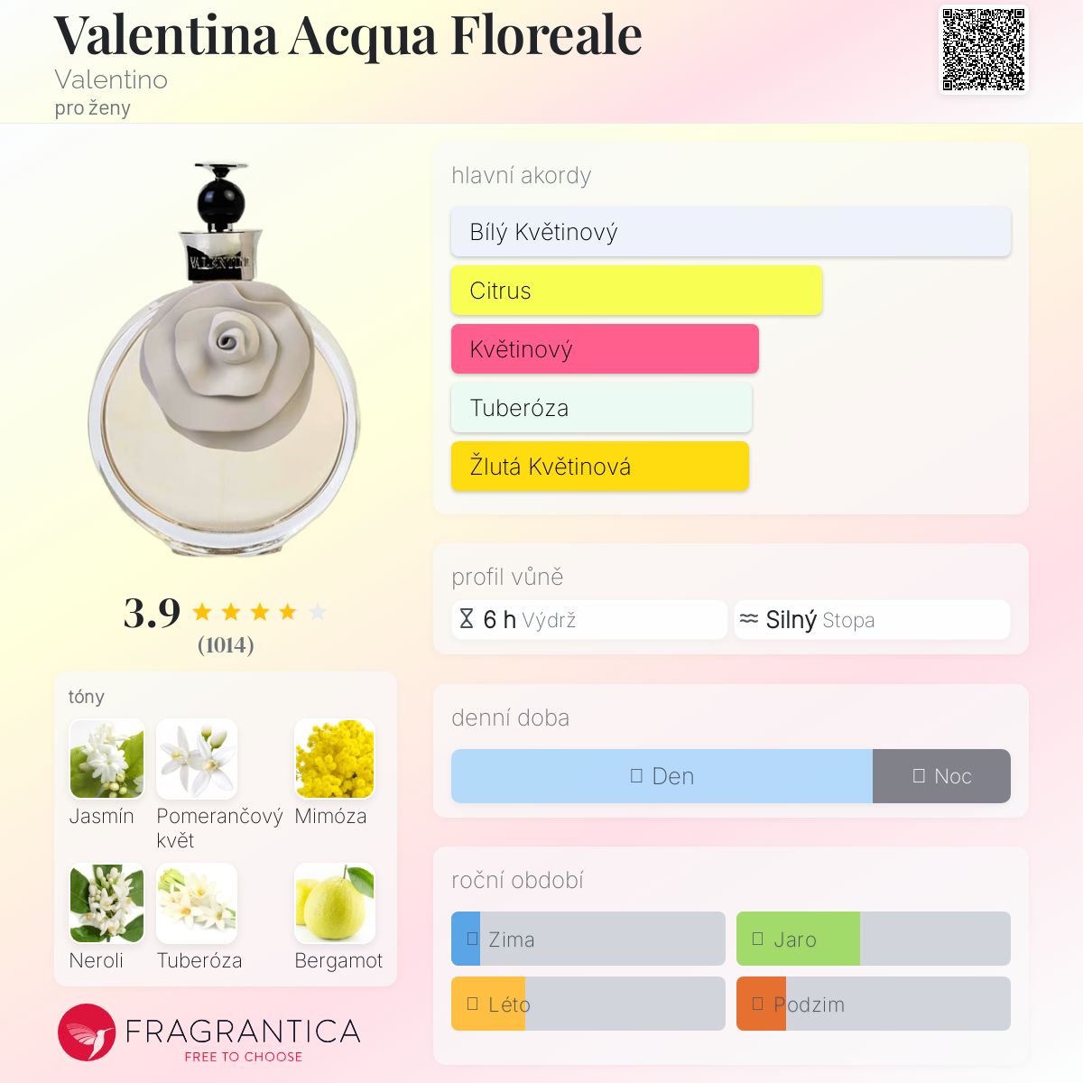 Valentina Acqua Floreale podle Valentino je Orientální Floral vůně pro ženy. Valentina Acqua Floreale byl/a uveden/a v roce 2013. "Nosem" za touto vůní je Olivier Cresp. Vrchní tóny jsou Pomerančový květ a Bergamot; střední tóny jsouJasmín, Mimóza, Neroli a Tuberóza ; základní tóny jsou Jantar (ambra) a Pačuli.