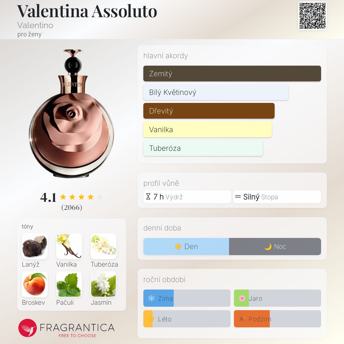 Valentina Assoluto podle Valentino je Chypre Floral vůně pro ženy. Valentina Assoluto byl/a uveden/a v roce 2012. "Nosem" za touto vůní je Olivier Cresp. Vrchní tóny jsou Lanýž, Broskev a Bergamot; střední tóny jsouMadagaskarská vanilka, Tuberóza a Italský jasmín ; základní tóny jsou Pačuli, Dubový mech a Cedr.