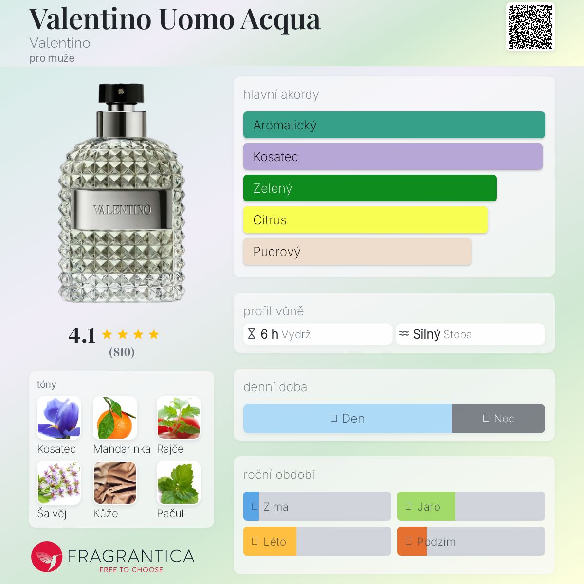 Valentino Uomo Acqua podle Valentino je Leather vůně pro muže. Valentino Uomo Acqua byl/a uveden/a v roce 2017. Vrchní tóny jsou Mandarinka a Rajče; střední tóny jsouŠalvěj a Pačuli ; základní tóny jsou Kosatec a Kůže.