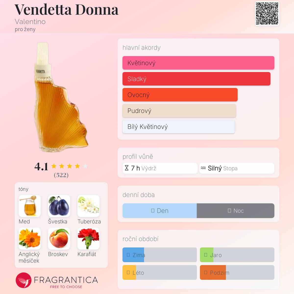 Vendetta Donna podle Valentino je Floral Fruity vůně pro ženy. Vendetta Donna byl/a uveden/a v roce 1991. "Nosem" za touto vůní je IFF. Vrchní tóny jsou Švestka, Broskev, Aldehydy, Hyacint, Pomerančový květ, Leknín, Zelené tóny a Bergamot; střední tóny jsouMed, Tuberóza, Měsíček, Karafiát, Narcis, Ylang-Ylang, Kořen orris, Jasmín, Růže, Otočník a Orchidej ; základní tóny jsou Benzoin, Jantar (ambra), Santalové dřevo, Vanilka, Fazole tonka, Pižmo, Pačuli, Cedr a Vetiver.