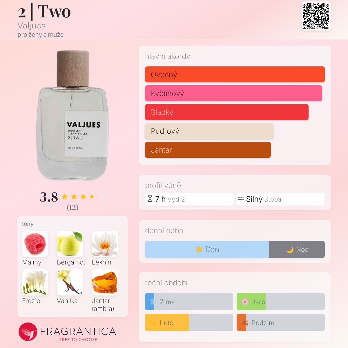 2 | Two podle Valjues je Floral Fruity vůně pro ženy a muže. Toto je nová vůně. 2 | Two byl/a uveden/a v roce 2024. Vrchní tón je Bergamot ; střední tóny jsouMaliny, Leknín a Frézie ; základní tóny jsou Vanilka, Jantar (ambra) a Pižmo.