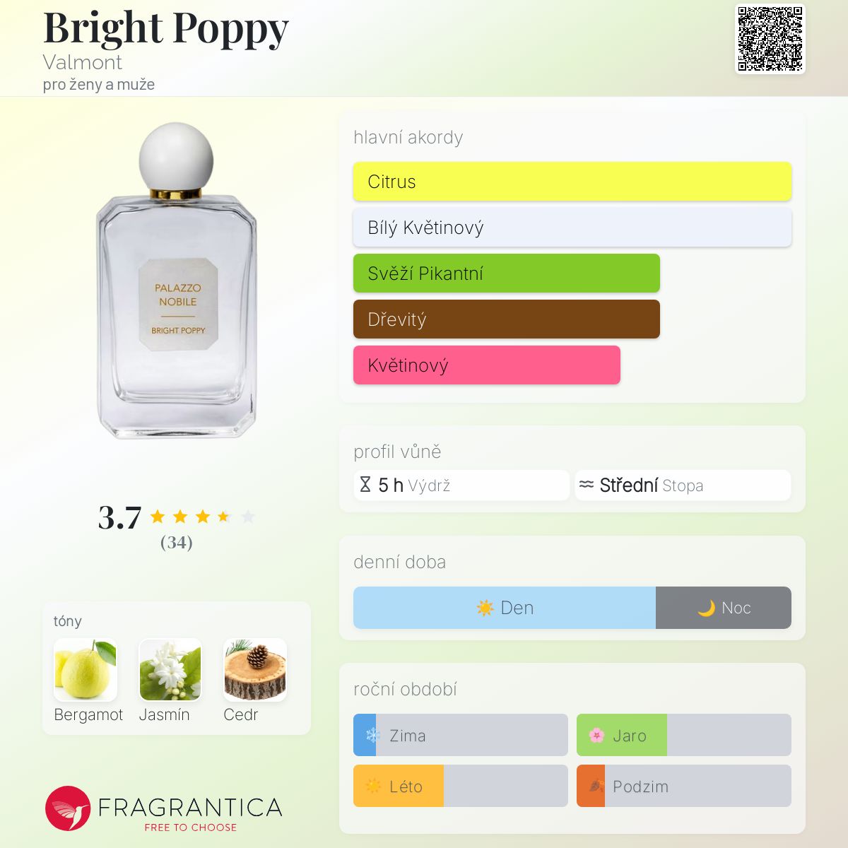 Bright Poppy podle Valmont je Citrus vůně pro ženy a muže. Bright Poppy byl/a uveden/a v roce 2020. Vrchní tón je Bergamot ; střední tón jeJasmín ; základní tón je Cedr.