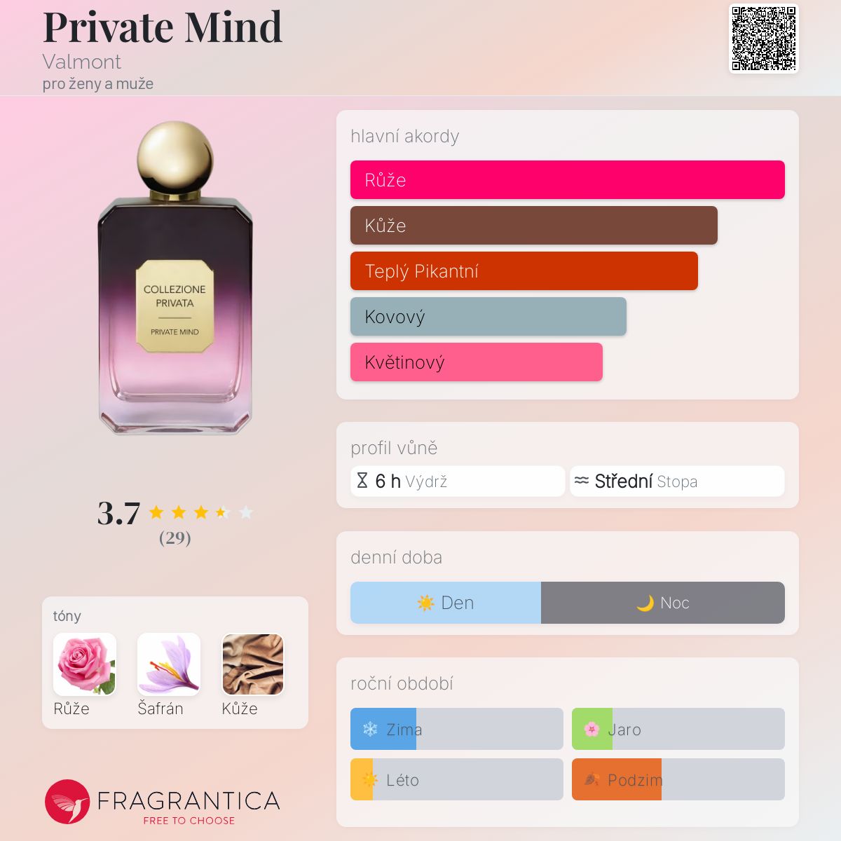 Private Mind podle Valmont je Leather vůně pro ženy a muže. Private Mind byl/a uveden/a v roce 2020. Vrchní tón je Šafrán ; střední tón jeRůže ; základní tón je Kůže.
