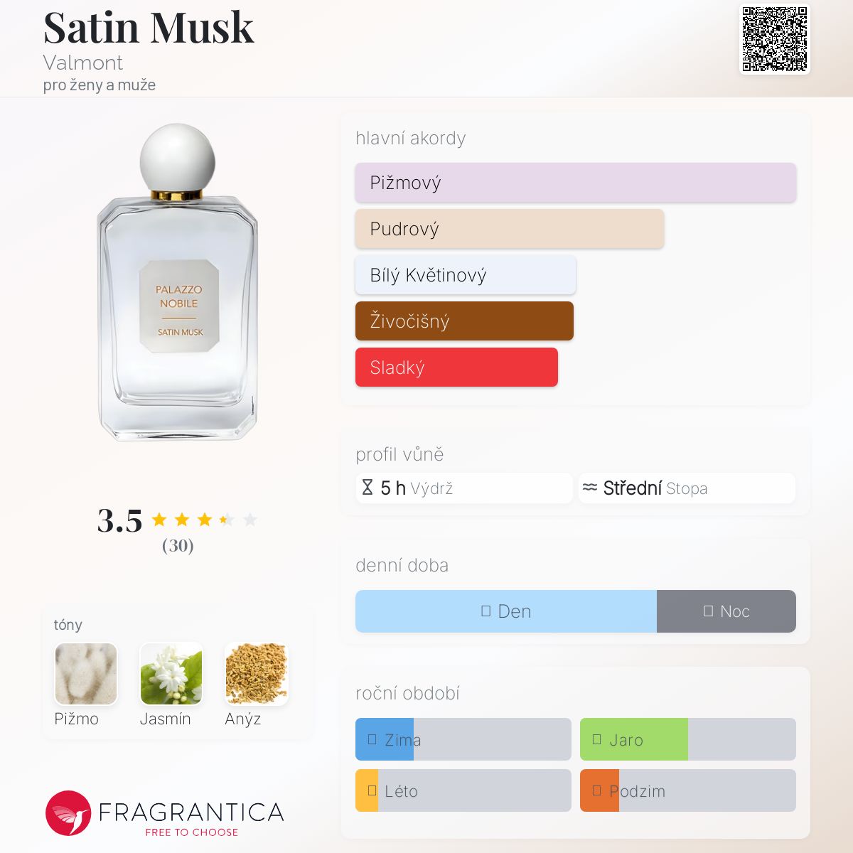 Satin Musk podle Valmont je Floral vůně pro ženy a muže. Satin Musk byl/a uveden/a v roce 2020. Vrchní tón je Anýz ; střední tón jeJasmín ; základní tón je Pižmo.