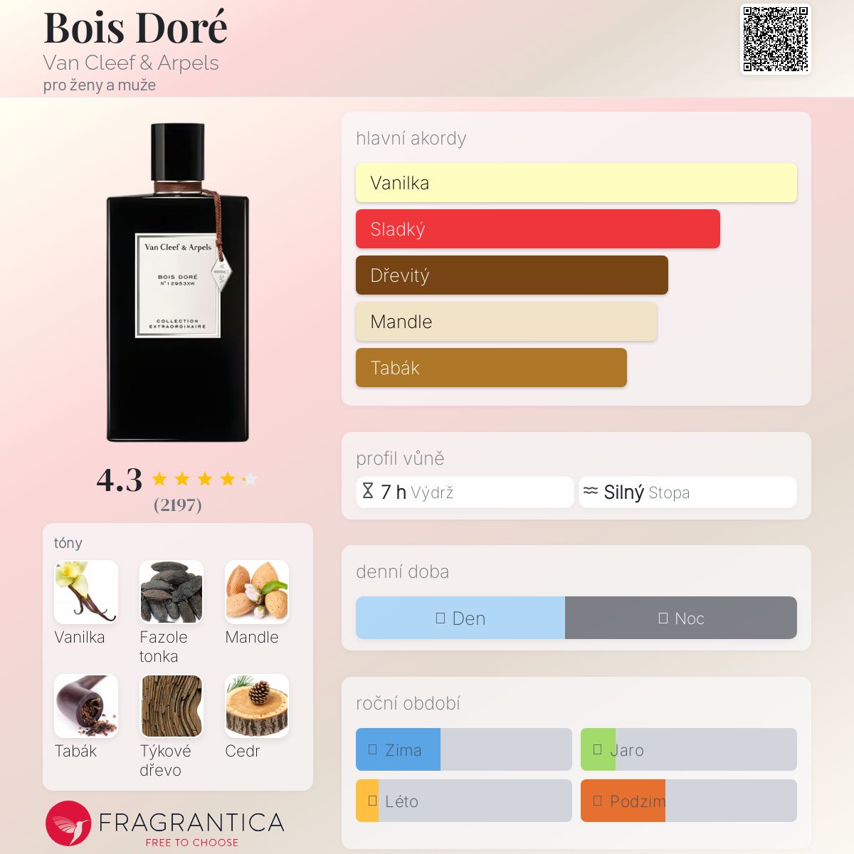 Bois Doré podle Van Cleef & Arpels je Orientální Woody vůně pro ženy a muže. Bois Doré byl/a uveden/a v roce 2017. "Nosem" za touto vůní je Fabrice Pellegrin. Vrchní tóny jsou Černý pepř a Minerální tóny; střední tóny jsouVanilka, Mandle, Tabák a Cedr ; základní tóny jsou Fazole tonka, Týkové dřevo a Pižmo.