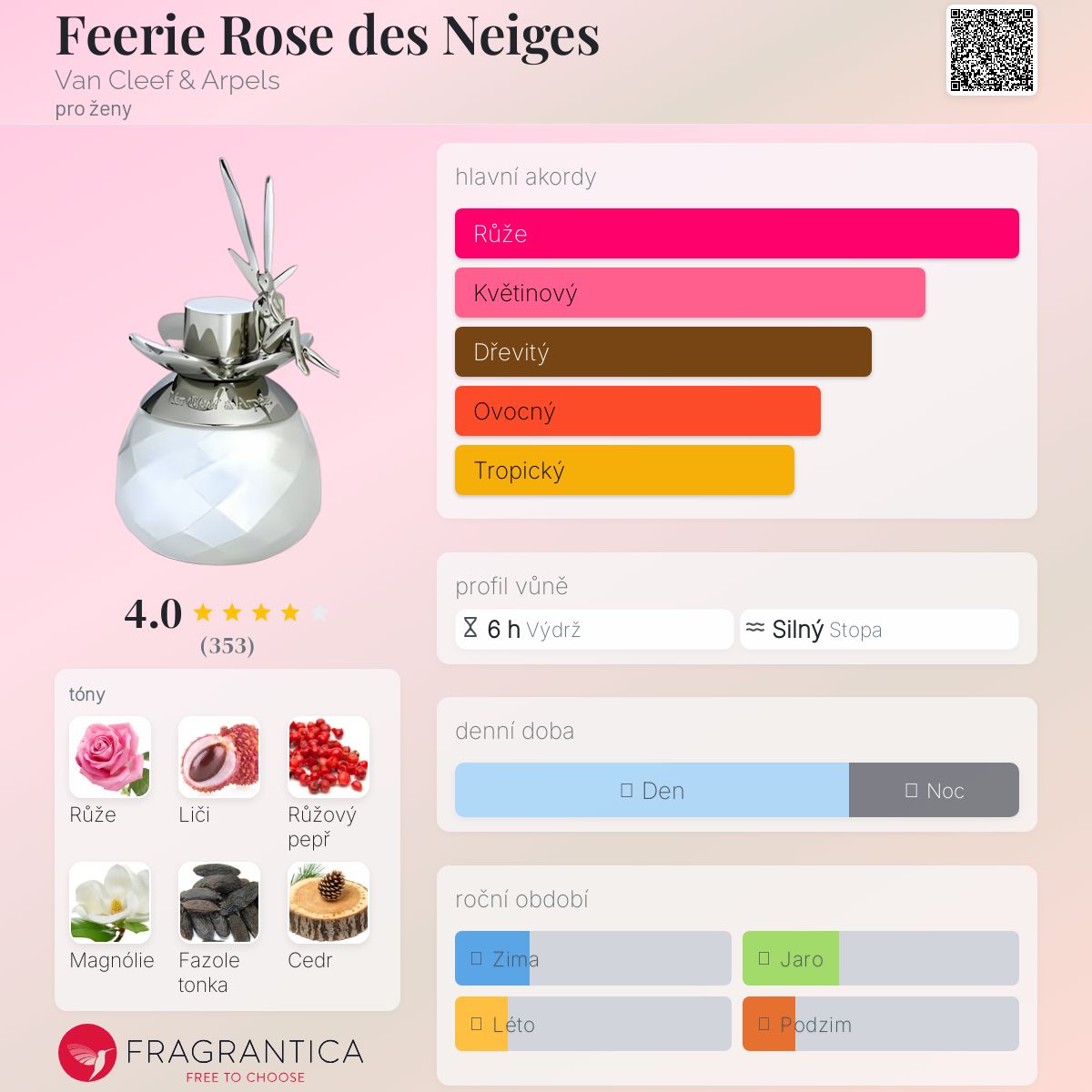Feerie Rose des Neiges podle Van Cleef & Arpels je Floral Fruity vůně pro ženy. Feerie Rose des Neiges byl/a uveden/a v roce 2011. Vrchní tóny jsou Liči a Růžový pepř; střední tóny jsouRůže a Magnólie ; základní tóny jsou Fazole tonka, Virginský cedr a Santalové dřevo.