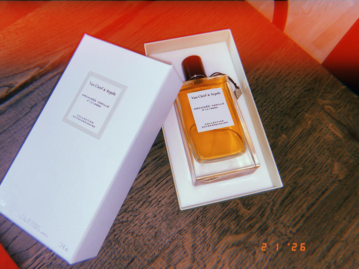 Nedávno se mi dostal do rukou tento, můj první z exkluzivní řady van Cleef & Arpels. Jedna z nejlépe vyrobených vůní, které jsem kdy cítila, kvalita esencí je ohromující. Má výrazný kadidlový vanilkový nádech, trochu připomíná kolínskou z misií. Když zaschne, přechází v mandlový likér s nádechem kakaa, takže je téměř gurmánská. Pouze v pozadí jsem vnímala akord orchideje a dřevitý nádech. Vzhledem k její hustotě by se podle mě měla nosit jen v chladných ročních obdobích, ale není vtíravá, její projekce je velmi umírněná, příjemná a intimní a k jejímu vnímání je třeba být blízko nositele. Drží výborně, na pokožce vydrží až 8 hodin. Sklenička je minimalistická, ale velmi dobře provedená do všech detailů, ale krabička je rafinovanější, vyztužená a s kapsičkou, která chrání tak vzácný předmět.