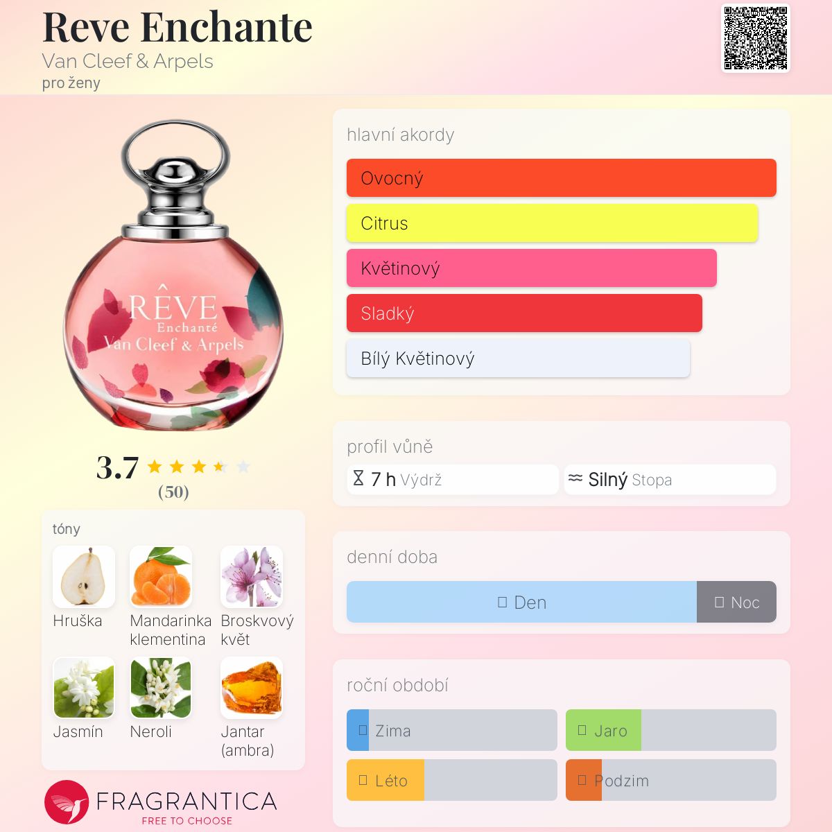 Reve Enchante podle Van Cleef & Arpels je Floral Fruity vůně pro ženy. Reve Enchante byl/a uveden/a v roce 2015. "Nosem" za touto vůní je Emilie Coppermann. Vrchní tóny jsou Hruška, Mandarinka klementina a Neroli; střední tóny jsouBroskvový květ a Jasmín ; základní tón je Bílý jantar (ambra).