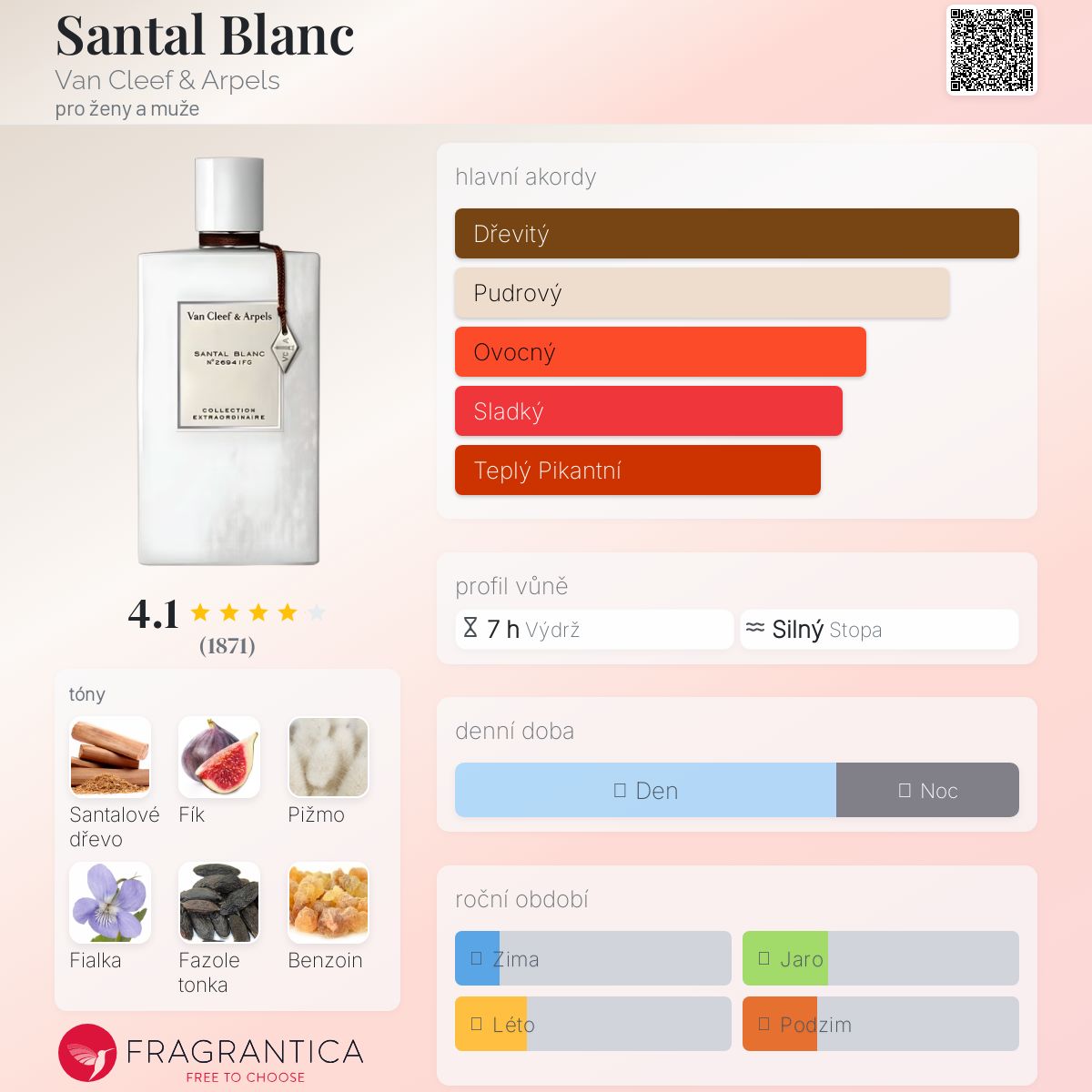 Santal Blanc podle Van Cleef & Arpels je Floral Woody Musk vůně pro ženy a muže. Santal Blanc byl/a uveden/a v roce 2019. "Nosem" za touto vůní je Michel Almairac. Vrchní tóny jsou Fíkový nektar a Mandarinka; střední tóny jsouSantalové dřevo a Fialka ; základní tóny jsou Pižmo, Fazole tonka a Benzoin.