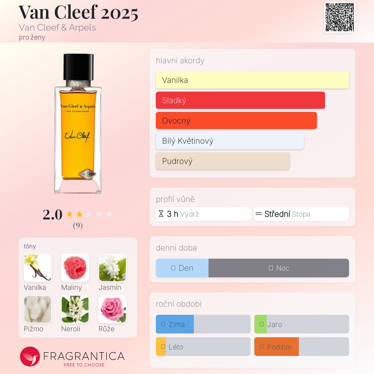 Van Cleef 2025 podle Van Cleef & Arpels je Floral Fruity vůně pro ženy. Toto je nová vůně. Van Cleef 2025 byl/a uveden/a v roce 2025. Vrchní tóny jsou Maliny, Neroli, Bergamot a Galbanum; střední tóny jsouJasmín, Růže, Pelargónie a Pomerančový květ ; základní tóny jsou Vanilka, Pižmo, Fazole tonka, Cedr a Santalové dřevo.