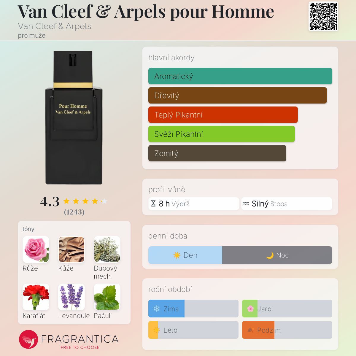 Van Cleef & Arpels pour Homme podle Van Cleef & Arpels je Leather vůně pro muže. Van Cleef & Arpels pour Homme byl/a uveden/a v roce 1978. "Nosem" za touto vůní je Louis Monnet. Vrchní tóny jsou Levandule, Jalovcové bobulky, Bazalka, Zelené tóny, Kmín, Šalvěj, Bergamot, Majoránka a Citrusy; střední tóny jsouRůže, Karafiát, Pačuli, Vetiver, Hřebíček, Jasmín, Kořeněné tóny, Cedr, Pelyněk a Kořen orris ; základní tóny jsou Kůže, Dubový mech, Pižmo, Santalové dřevo, Labdanum, Jantar (ambra) a Kokos.