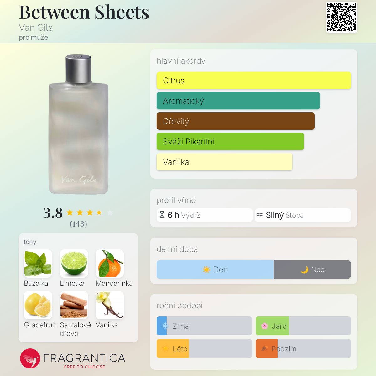 Between Sheets podle Van Gils je Citrus vůně pro muže. Between Sheets byl/a uveden/a v roce 1997. Vrchní tóny jsou Limetka, Mandarinka a Grapefruit; střední tóny jsouBazalka a Levandule ; základní tóny jsou Santalové dřevo, Vanilka, Fazole tonka, Cedr a Vetiver.