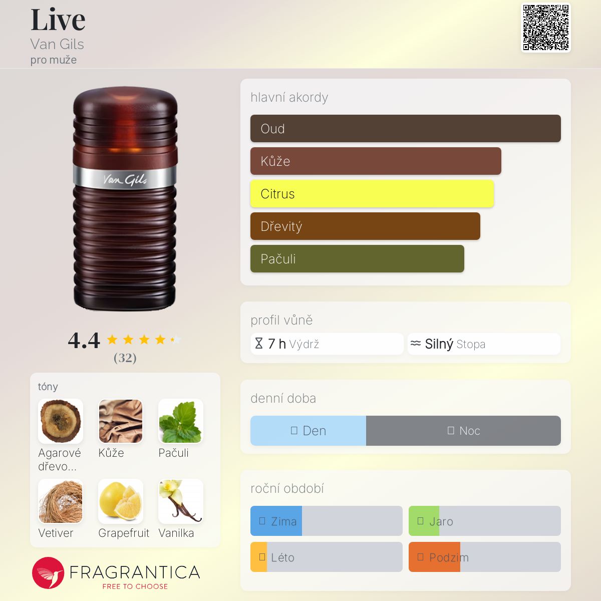 Live podle Van Gils je Orientální Woody vůně pro muže. Live byl/a uveden/a v roce 2013. Vrchní tóny jsou Pomeranč a Grapefruit; střední tóny jsouPačuli a Vetiver ; základní tóny jsou Agarové dřevo (oud), Kůže a Vanilka.