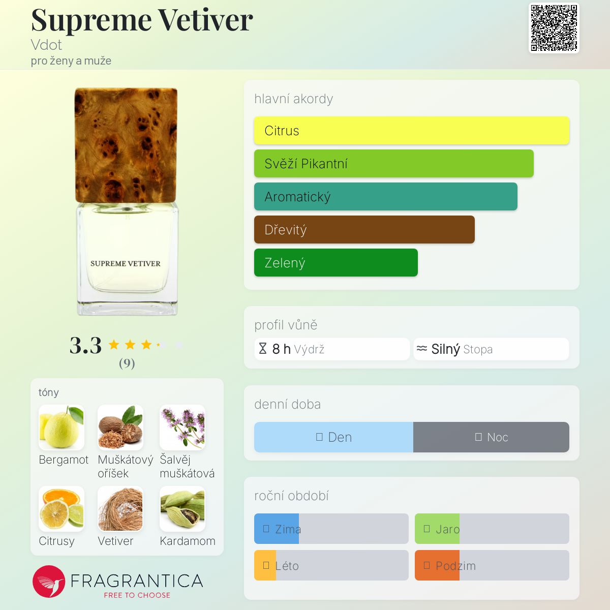Supreme Vetiver podle Vdot je Citrus vůně pro ženy a muže. Supreme Vetiver byl/a uveden/a v roce 2020. "Nosem" za touto vůní je Nikita Kharlashin. Vrchní tóny jsou Bergamot, Muškátový oříšek, Šalvěj muškátová a Kardamom; střední tóny jsouCitrusy a Zelený čaj ; základní tóny jsou Vetiver, Cedr a Santalové dřevo.