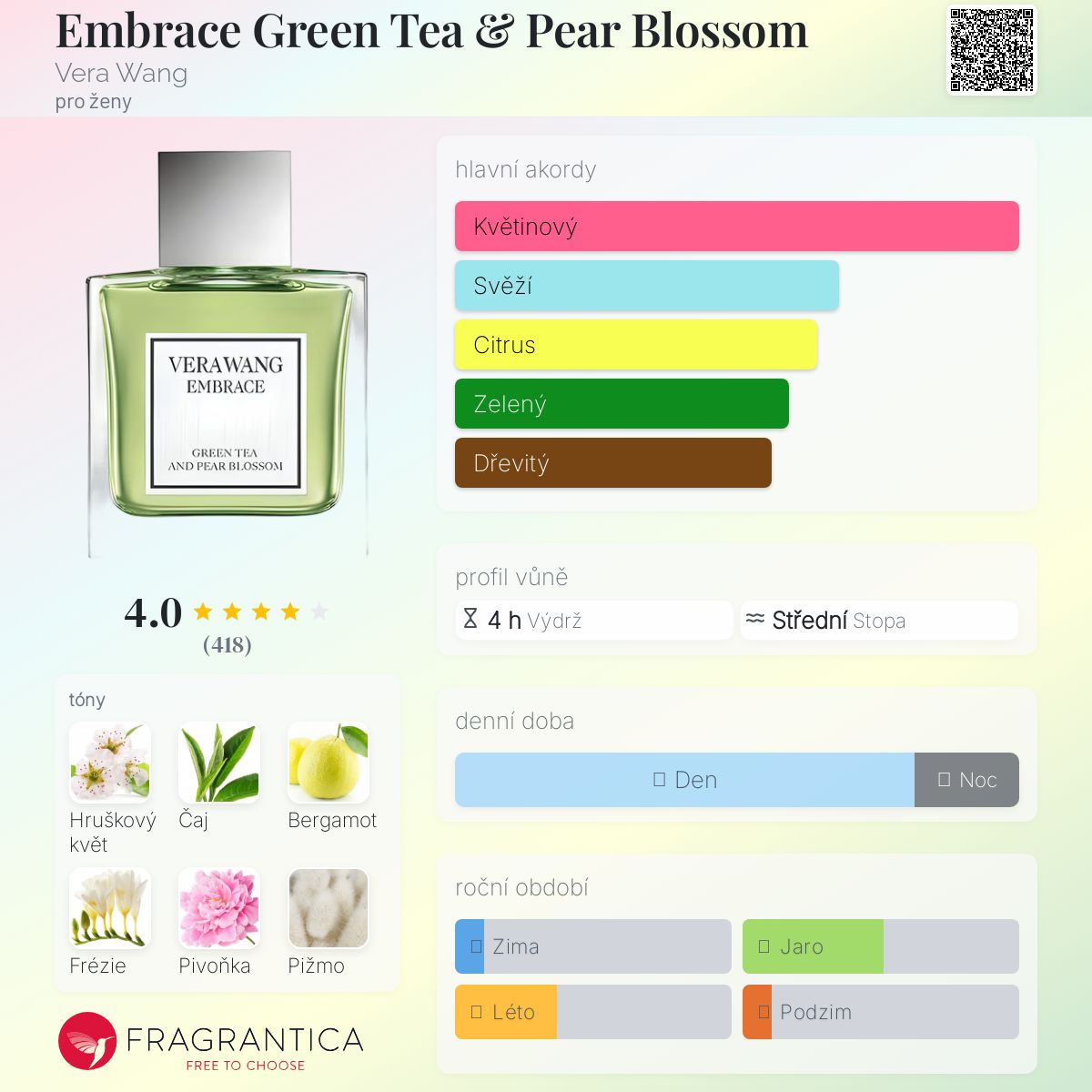 Embrace Green Tea & Pear Blossom podle Vera Wang je Floral Woody Musk vůně pro ženy. Embrace Green Tea & Pear Blossom byl/a uveden/a v roce 2015. "Nosem" za touto vůní je Natasha Côté. Vrchní tóny jsou Hruškový květ, Zelený čaj a Bergamot; střední tóny jsouFrézie, Pivoňka a Pomerančový květ ; základní tóny jsou Pižmo, Cedr a Santalové dřevo.