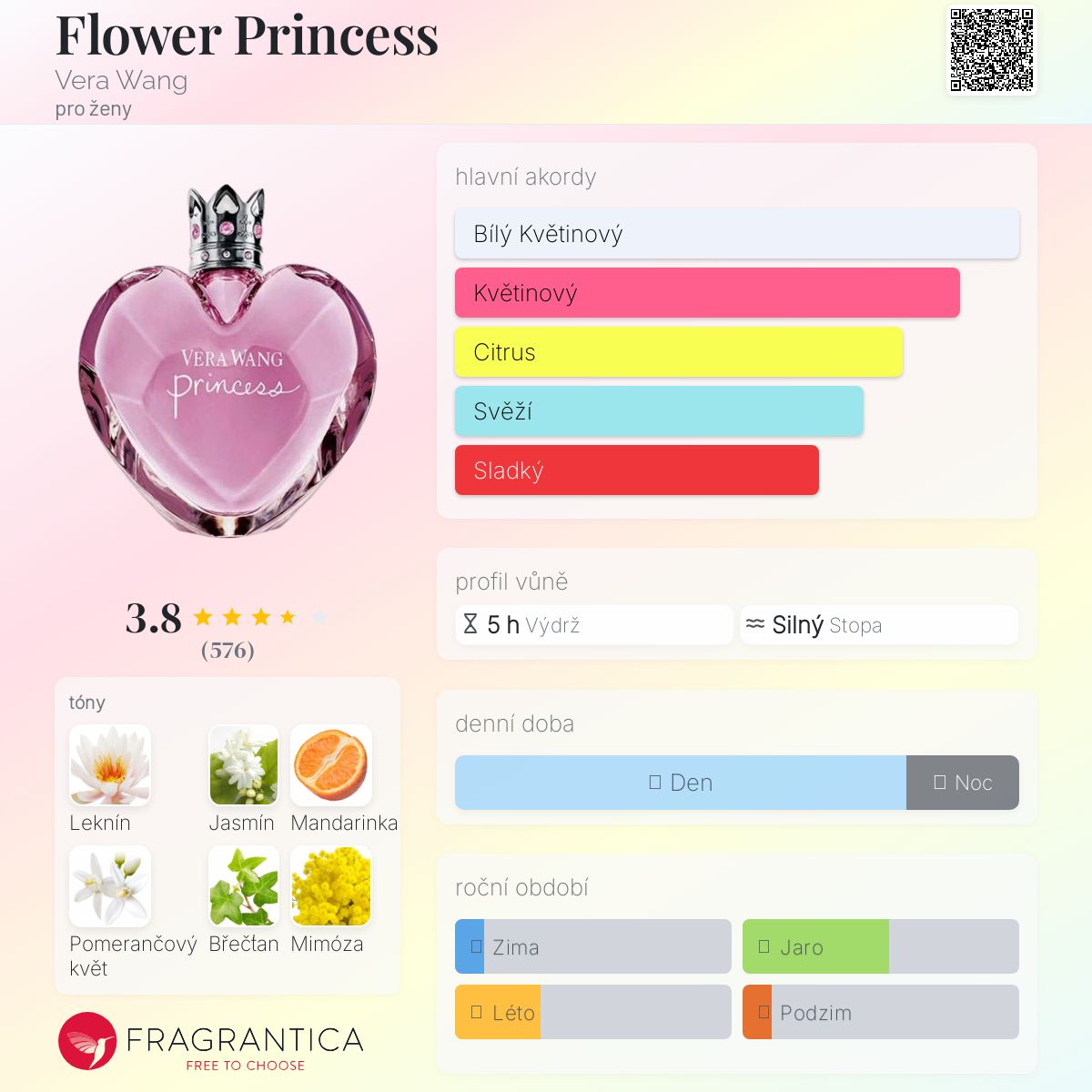 Flower Princess podle Vera Wang je Floral Fruity vůně pro ženy. Flower Princess byl/a uveden/a v roce 2006. "Nosem" za touto vůní je Harry Fremont. Vrchní tóny jsou Leknín, Mandarinka a Břečťan; střední tóny jsouJasmín, Pomerančový květ, Mimóza a Marocká růže ; základní tóny jsou Meruňka, Pižmo, Vzácné dřevo a Jantar (ambra).