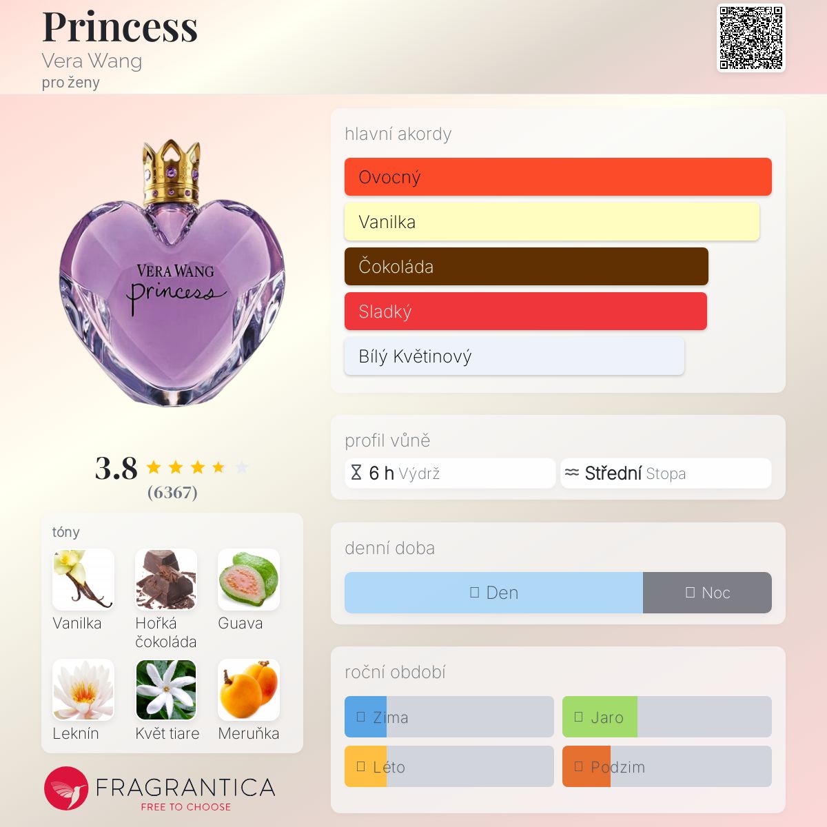 Princess podle Vera Wang je Orientální Floral vůně pro ženy. Princess byl/a uveden/a v roce 2006. Princess byl/a vytvořen/a Ilias Ermenidis a Harry Fremont. Vrchní tóny jsou Leknín, Meruňka, Jablko a Mandarinka; střední tóny jsouHořká čokoláda, Guava, Květ tiare a Tuberóza ; základní tóny jsou Vanilka, Jantar (ambra) a Dřevité tóny.