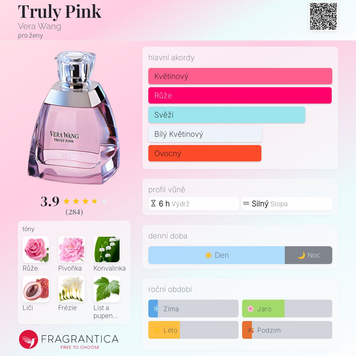 Truly Pink podle Vera Wang je Floral vůně pro ženy. Truly Pink byl/a uveden/a v roce 2006. Vrchní tóny jsou Liči, Frézie a Kasie; střední tóny jsouRůžová růže, Pivoňka a Konvalinka ; základní tóny jsou Kosatec a Dřevité tóny.