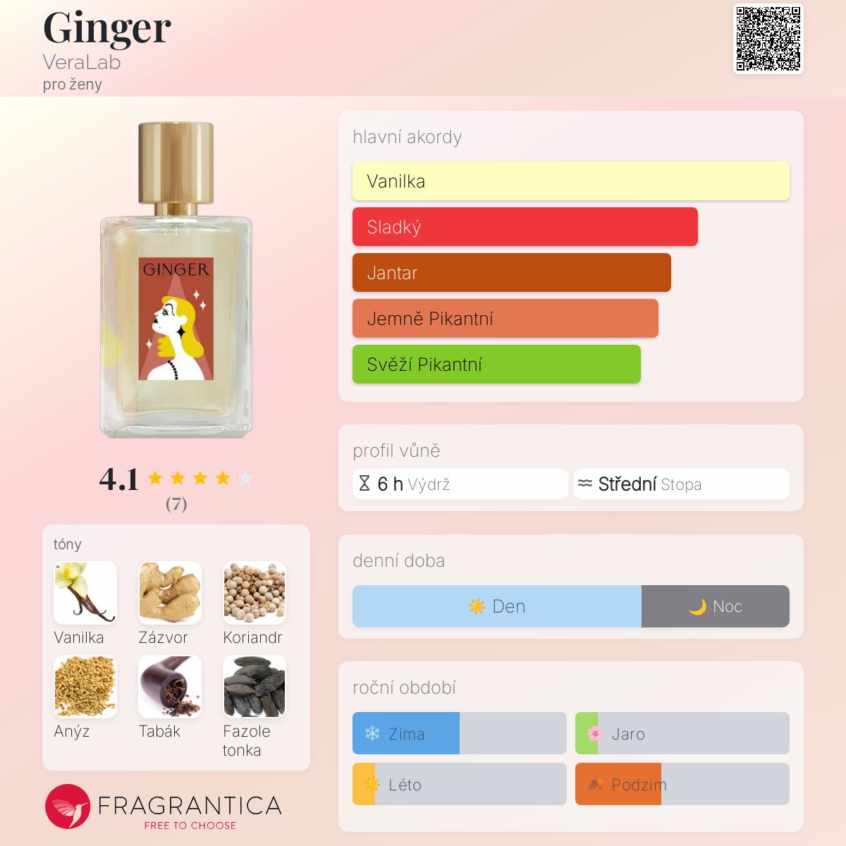 Ginger podle VeraLab je Orientální Vanilla vůně pro ženy. Toto je nová vůně. Ginger byl/a uveden/a v roce 2025. Vrchní tóny jsou Zázvor, Koriandr a Anýz; střední tóny jsouTabákový list, Otočník a Švestka ; základní tóny jsou Vanilka, Fazole tonka, Styrax a Peruánský balzám.