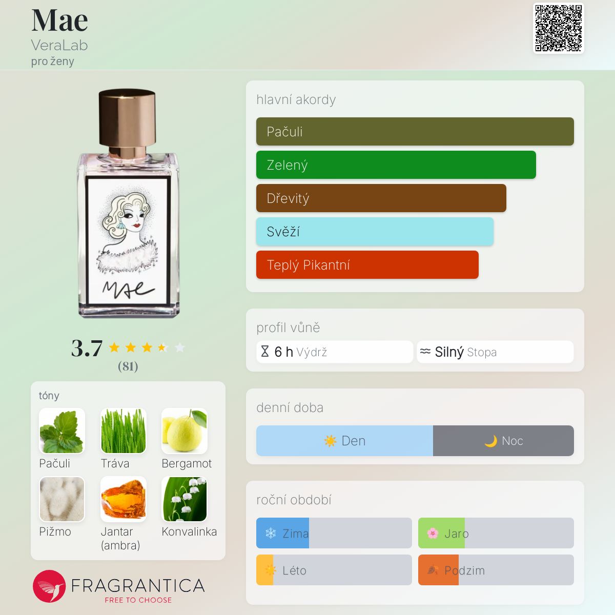 Mae podle VeraLab je vůně pro ženy. Mae byl/a uveden/a v roce 2019. "Nosem" za touto vůní je Paola Bottai. Vrchní tóny jsou Tráva a Bergamot; střední tóny jsouPačuli, Konvalinka a Jasmín ; základní tóny jsou Pižmo a Jantar (ambra).