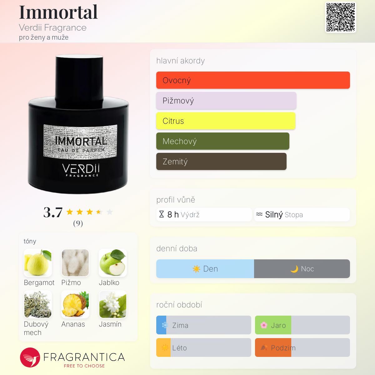 Immortal podle Verdii Fragrance je Chypre Fruity vůně pro ženy a muže. Immortal byl/a uveden/a v roce 2020. "Nosem" za touto vůní je Jérôme Epinette. Vrchní tóny jsou Bergamot, Jablko, Ananas a Černý rybíz; střední tóny jsouJasmín, Pačuli a Růže ; základní tóny jsou Pižmo, Dubový mech, Jantar (ambra) a Vanilka.