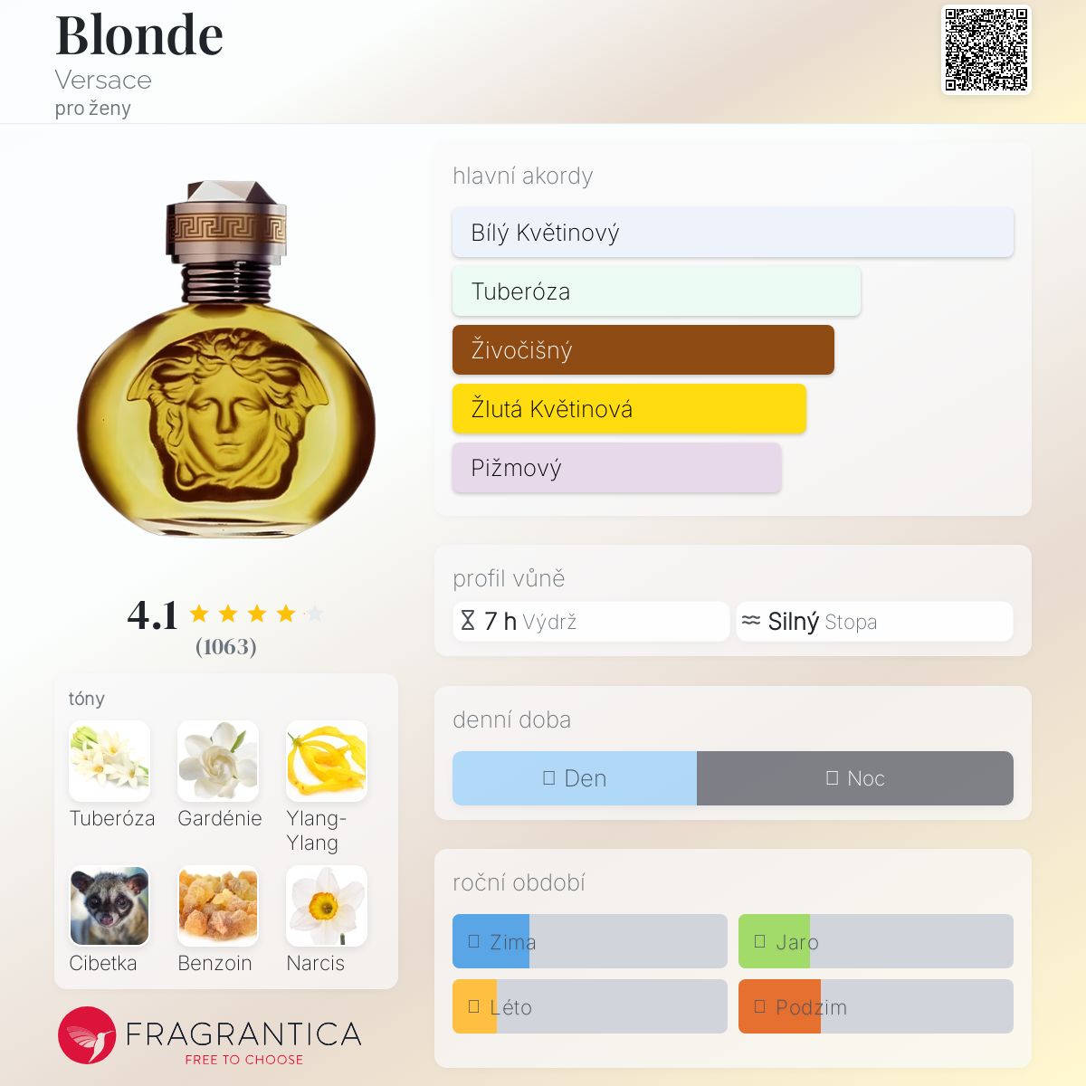 Blonde podle Versace je Floral vůně pro ženy. Blonde byl/a uveden/a v roce 1995. "Nosem" za touto vůní je Nathalie Feisthauer. Vrchní tóny jsou Gardénie, Fialka, Slizoplod, Neroli a Bergamot; střední tóny jsouTuberóza, Ylang-Ylang, Narcis a Karafiát ; základní tóny jsou Cibetka, Benzoin a Pižmo.
