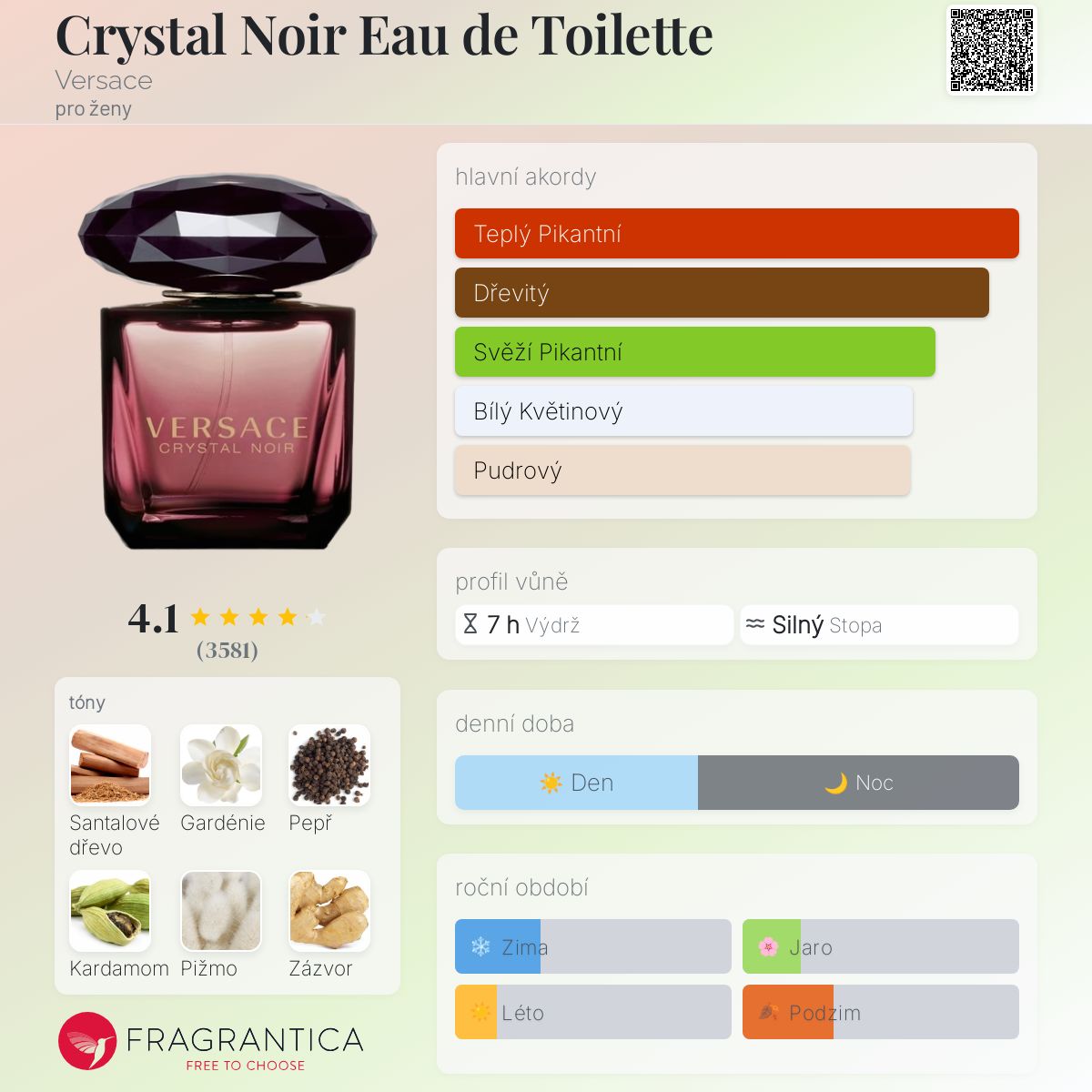 Crystal Noir Eau de Toilette podle Versace je Floral vůně pro ženy. Crystal Noir Eau de Toilette byl/a uveden/a v roce 2004. "Nosem" za touto vůní je Antoine Lie. Vrchní tóny jsou Pepř, Kardamom a Zázvor; střední tóny jsouGardénie, Pomerančový květ a Pivoňka ; základní tóny jsou Santalové dřevo, Pižmo a Jantar (ambra).