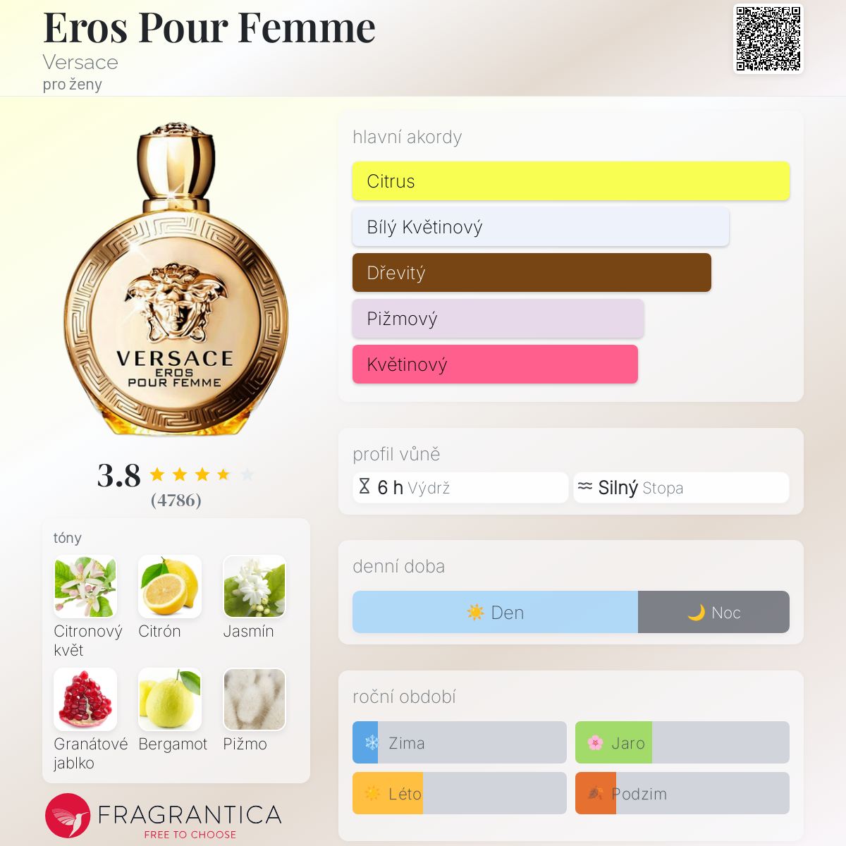 Eros Pour Femme podle Versace je Floral Woody Musk vůně pro ženy. Eros Pour Femme byl/a uveden/a v roce 2014. Eros Pour Femme byl/a vytvořen/a Alberto Morillas, Olivier Cresp a Nathalie Lorson. Vrchní tóny jsou Sicilský citron, Granátové jablko a Kalábrijský bergamot; střední tóny jsouCitronový květ, Jasmín Sambac, Jasmín a Pivoňka ; základní tóny jsou Pižmo, Ambroxan, Dřevité tóny a Santalové dřevo.